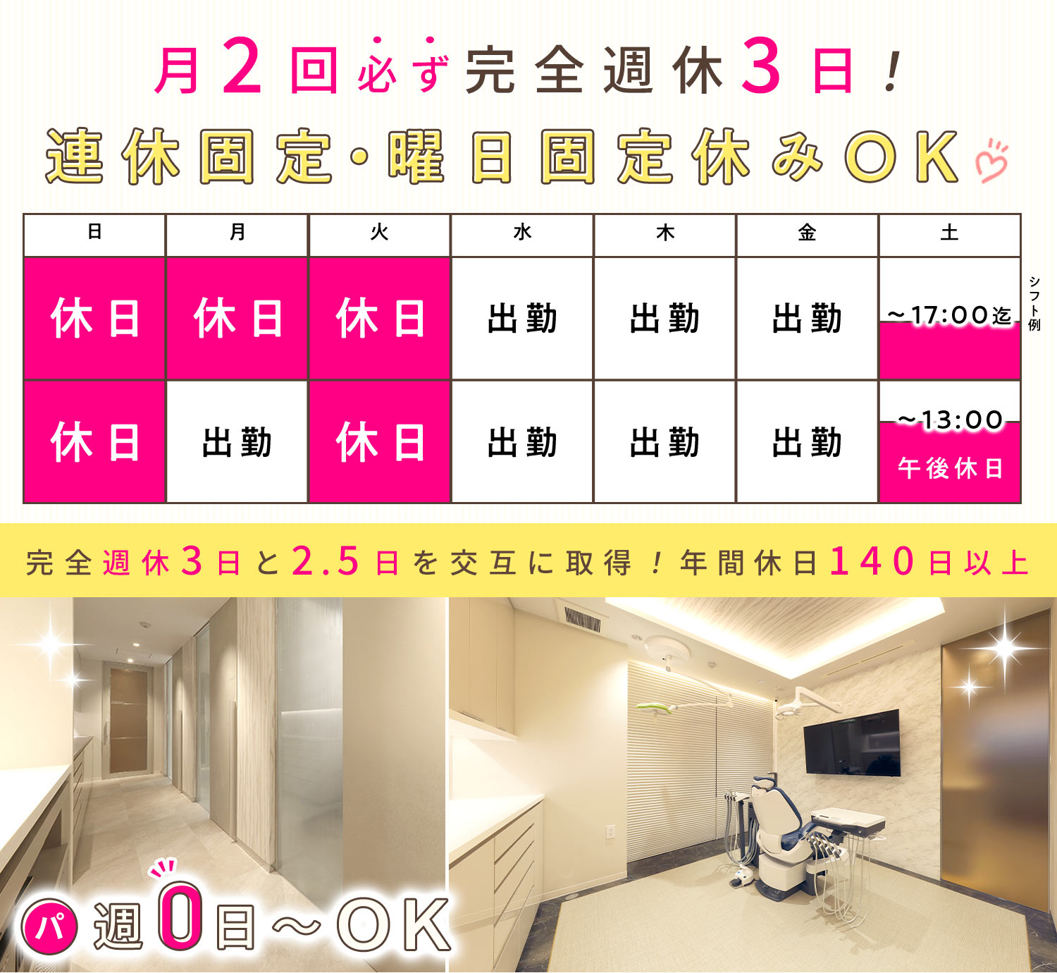 | 休日・休暇 | 勤務曜日は自由にご相談ください ※週0日~OK(月に2回などOK) <休診>火曜・祝日(祝日の振替出勤なし) <休暇>有給、GW、夏季、年末年始(各約7日) |