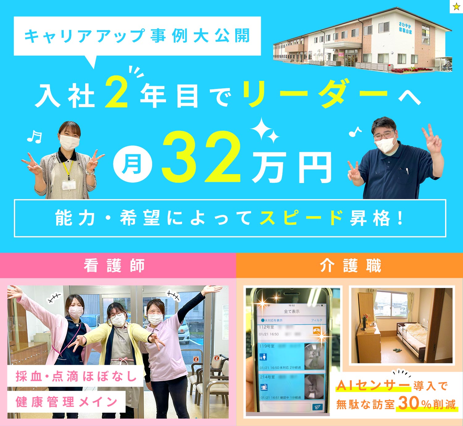 | 応募資格 | 正・准看護師 #ブランクOK ※介護施設未経験OK ※経験の浅い方もOK ※シニアやミドルも歓迎 |
