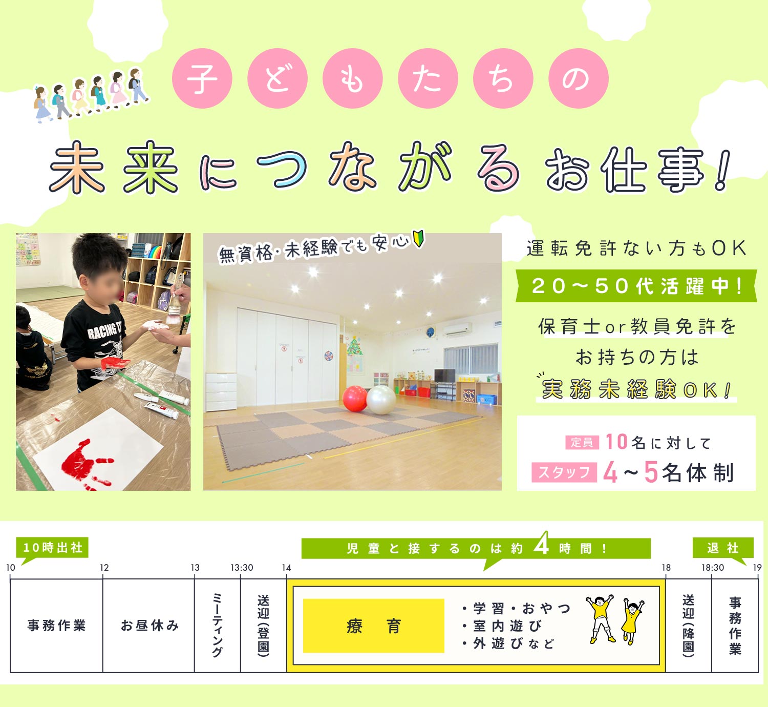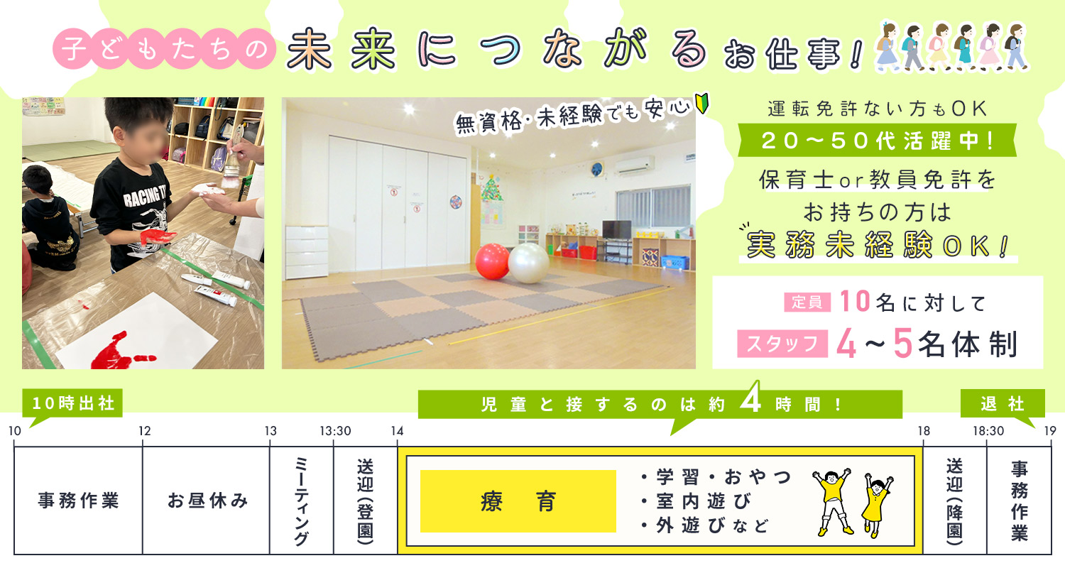| 応募資格 | 無資格・未経験OK #ブランクOK ※要普通自動車免許(AT限定可)/送迎業務あり ※実務未経験OK #ブランクOK ※放課後等デイサービス勤務未経験OK ※男女不問 ※事務・飲食・美容師・販売・営業など、異業種からの転職も歓迎 |