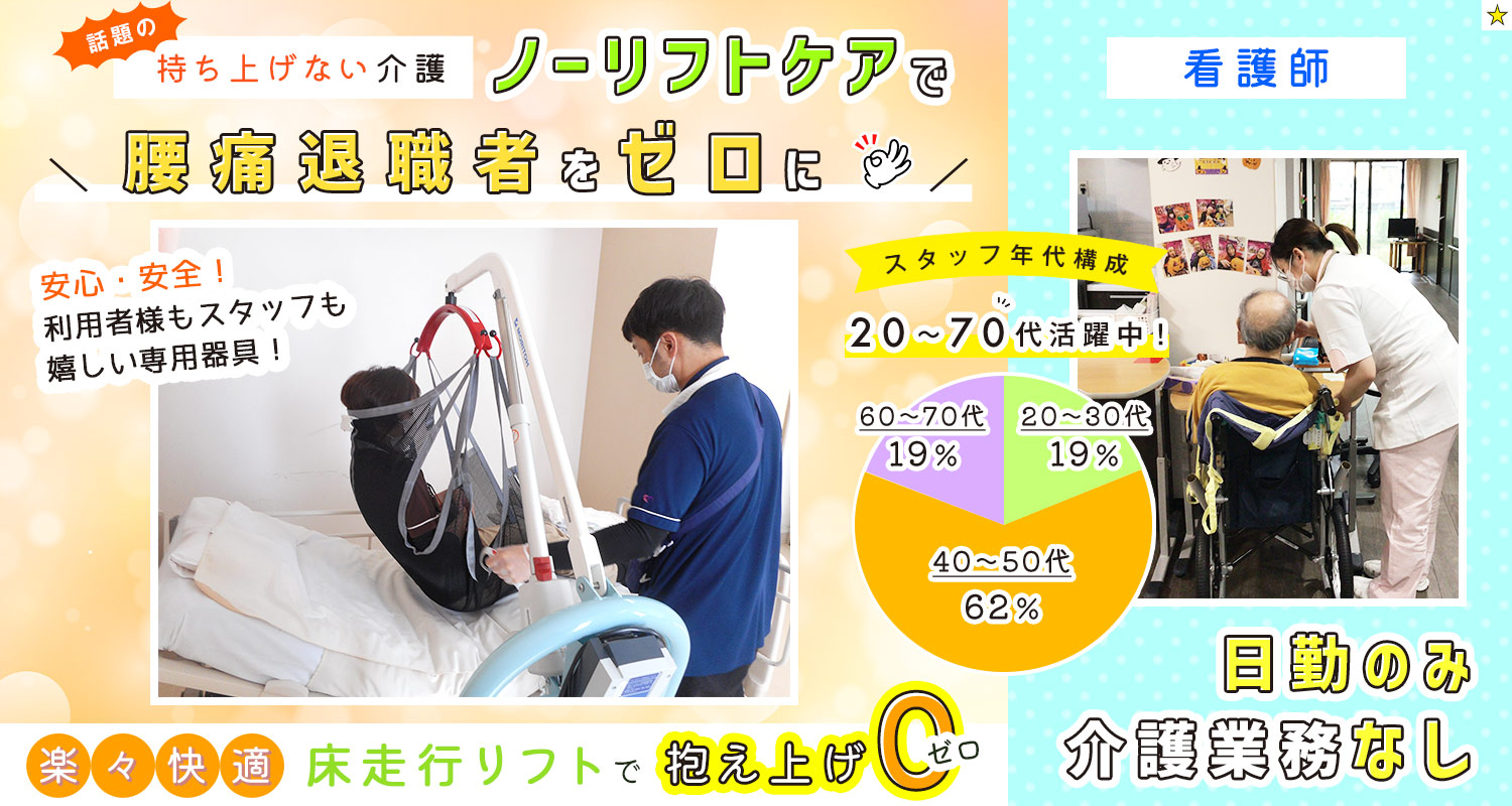 | 応募資格 | 正看護師資格をお持ちの方 #ブランクOK #50代以上応募可 ※介護施設未経験OK!病棟などからの転職も歓迎 |