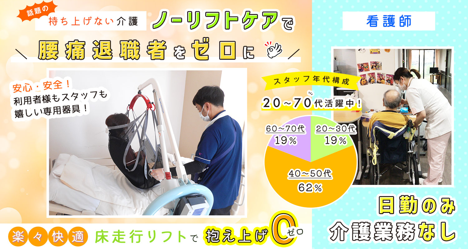 スライディングボード、床走行式リフト、入浴介助専門パートの配置などにより、腰痛による退職者はゼロ◎