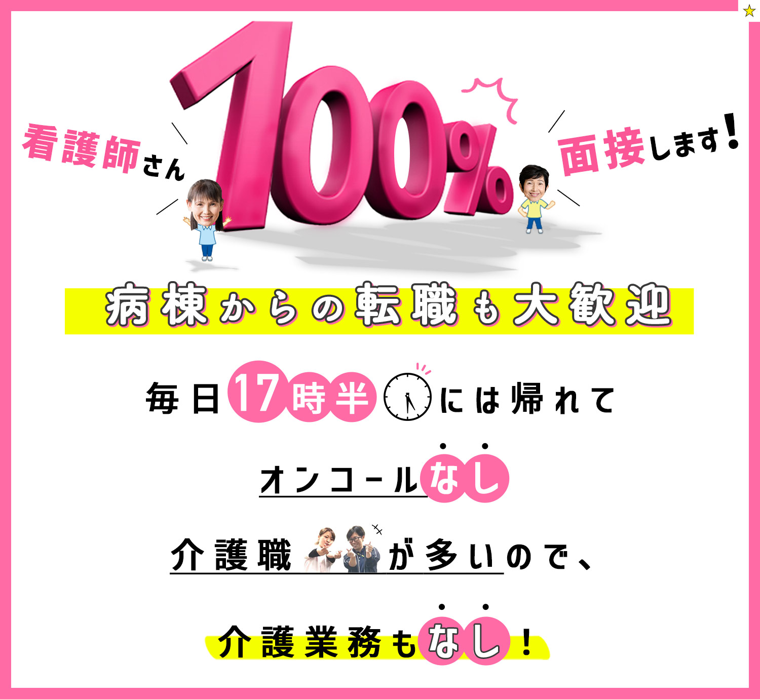 | 応募資格 | (1)正看護師 (2)准看護師 #ブランクOK(10年以上のブランクもOK) ※福祉施設での勤務未経験OK ※年齢不問!ミドル・シニアもOK ※普通自動車免許(AT限定可)をお持ちの方は歓迎(運転免許がない方も応募OK) |