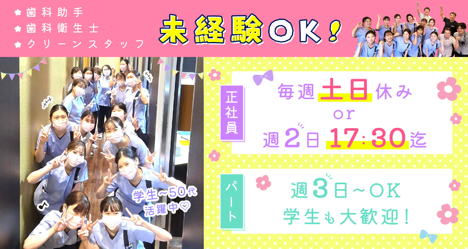 | 仕事内容 | (1)歯科衛生士[社] (2)歯科衛生士・時短勤務[パ] 診療補助、スケーリング、PMTC、TBI、SRP、ホワイトニング、院内清掃などをお願いします。 <様々な知識が学べる歯科医院> 当院では幅広い歯科医療を提供できるよう、最新の設備・技術を積極的に導入しています。 PMTCや外科処置の患者様が多く、色々な経験を積みながら、スキルを活かせる環境が整っています! また、経験豊富な衛生士が多数在籍しているのも当院の特長。 一つずつ丁寧にレクチャーしますし、経験の浅い方、ブランクのある方もご応募をお待ちしております。 |