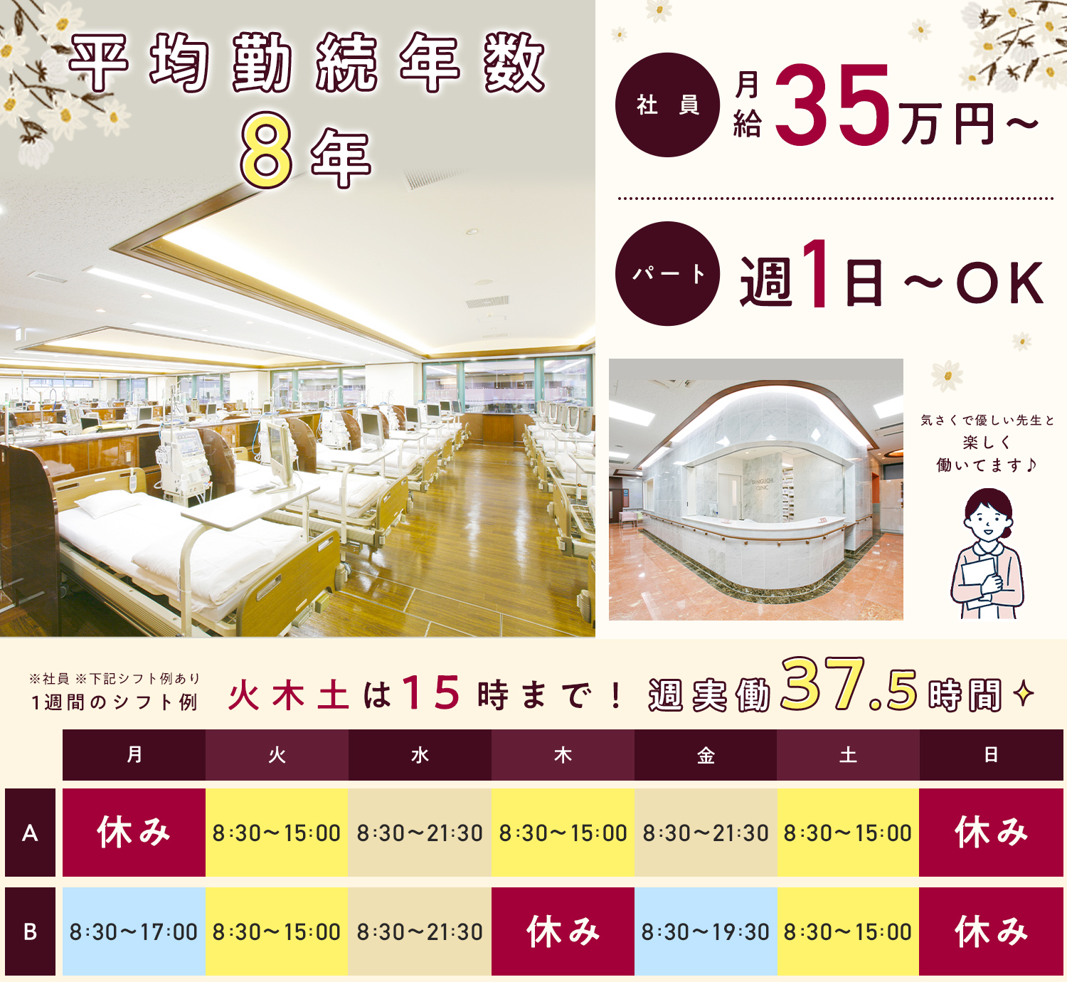 | 仕事内容 | クリニックの看護師/社員で週3回は15時迄[社] ※一般外来における看護業務 診療の補助、採血、点滴など看護業務全般 ※透析室における看護業務 穿刺・回収などの透析業務及び透析看護業務全般 ※内視鏡検査における看護業務 器具の洗浄、内視鏡検査の介助など内視鏡検査業務全般 □□□ 「いい仕事は、いいオフから」という考えのもと、ワークライフバランスの充実に努めている当院。 スタッフ増員で、今以上に働きやすい環境を整えます! |