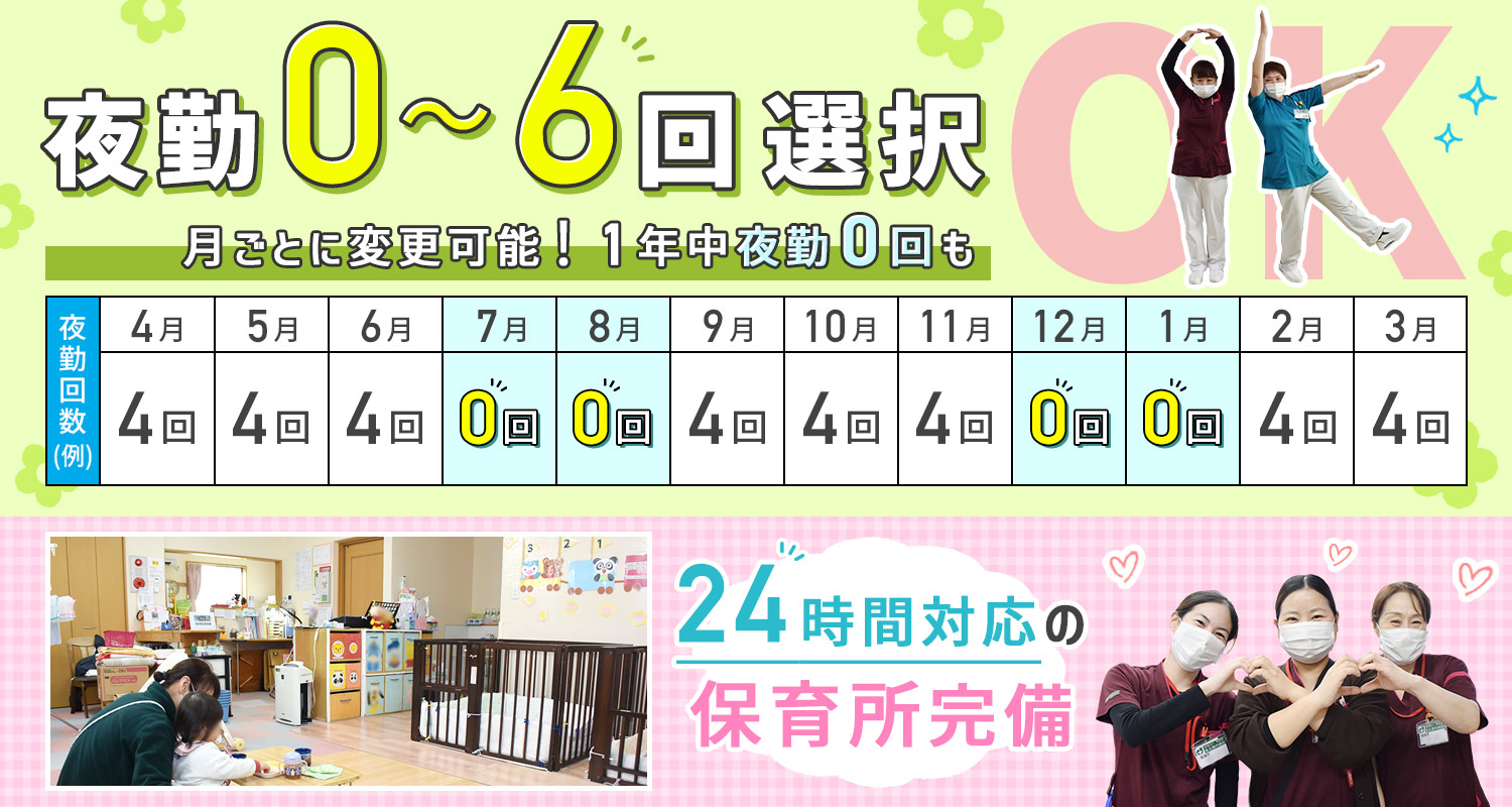 基本は日勤と夜勤の交替制ですが、夜勤は0~6回で相談可能で、日勤のみもOK!