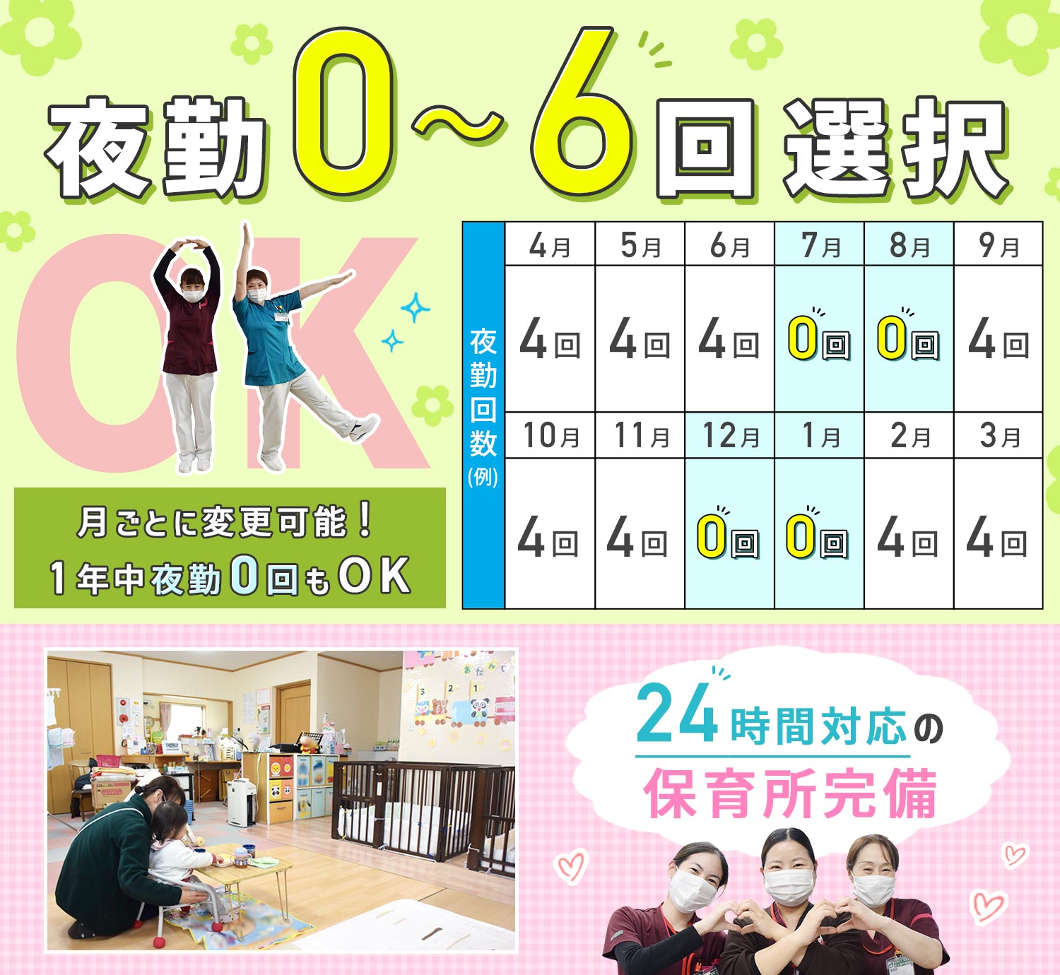 ★夜勤回数は月ごとに変更OK (例…今月は4回、来月は子どもが夏休みなので0回、など)