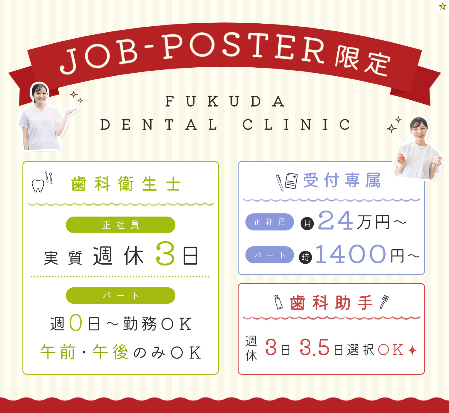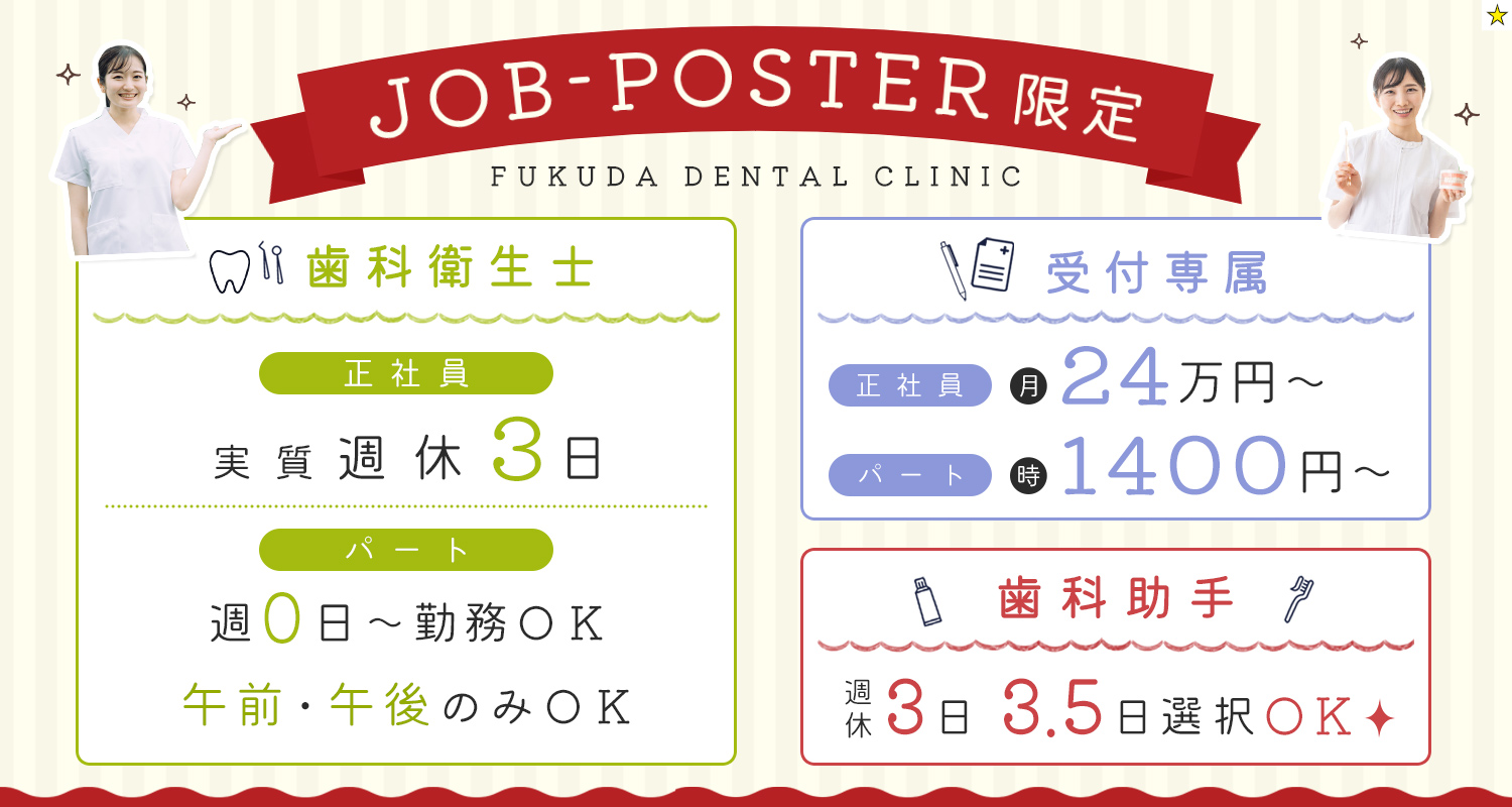 | 待 遇 | ※[社][パ]共通 #入社祝い金あり [社]3万円[パ]1万円(入社6ヶ月後に支給) 昇給あり 年1回 歯科医師国保・雇用保険・労災保険※規定あり 交通費全額支給 バイク・自転車通勤OK 残業手当(1分単位で支給)※専任の社労士がきっちり給与計算致します 制服貸与 ※[社]のみ 賞与あり 年2回 ※業績による #住宅手当あり 月5000円(交通費の掛からない方全員対象) #車通勤OK (駐車場代全額支給) 退職金制度(勤続年数3年以上) |
