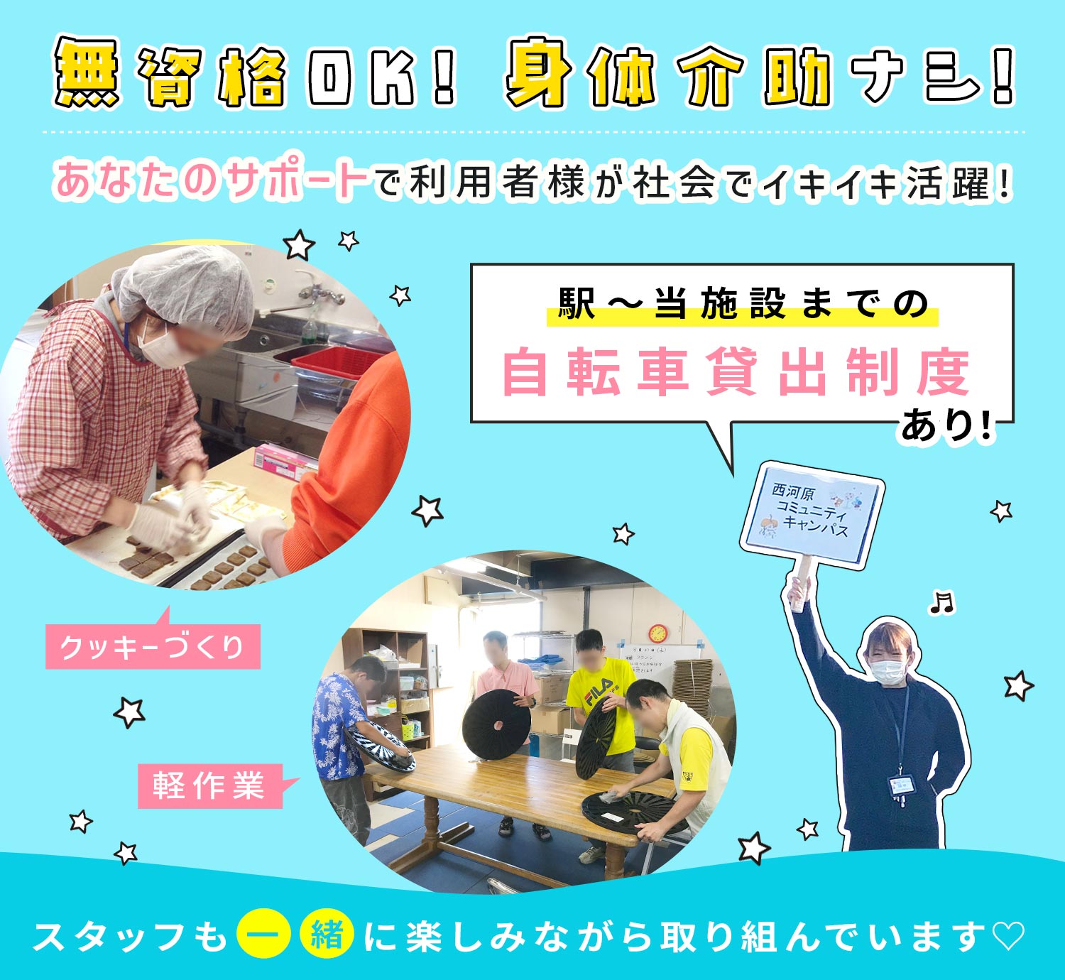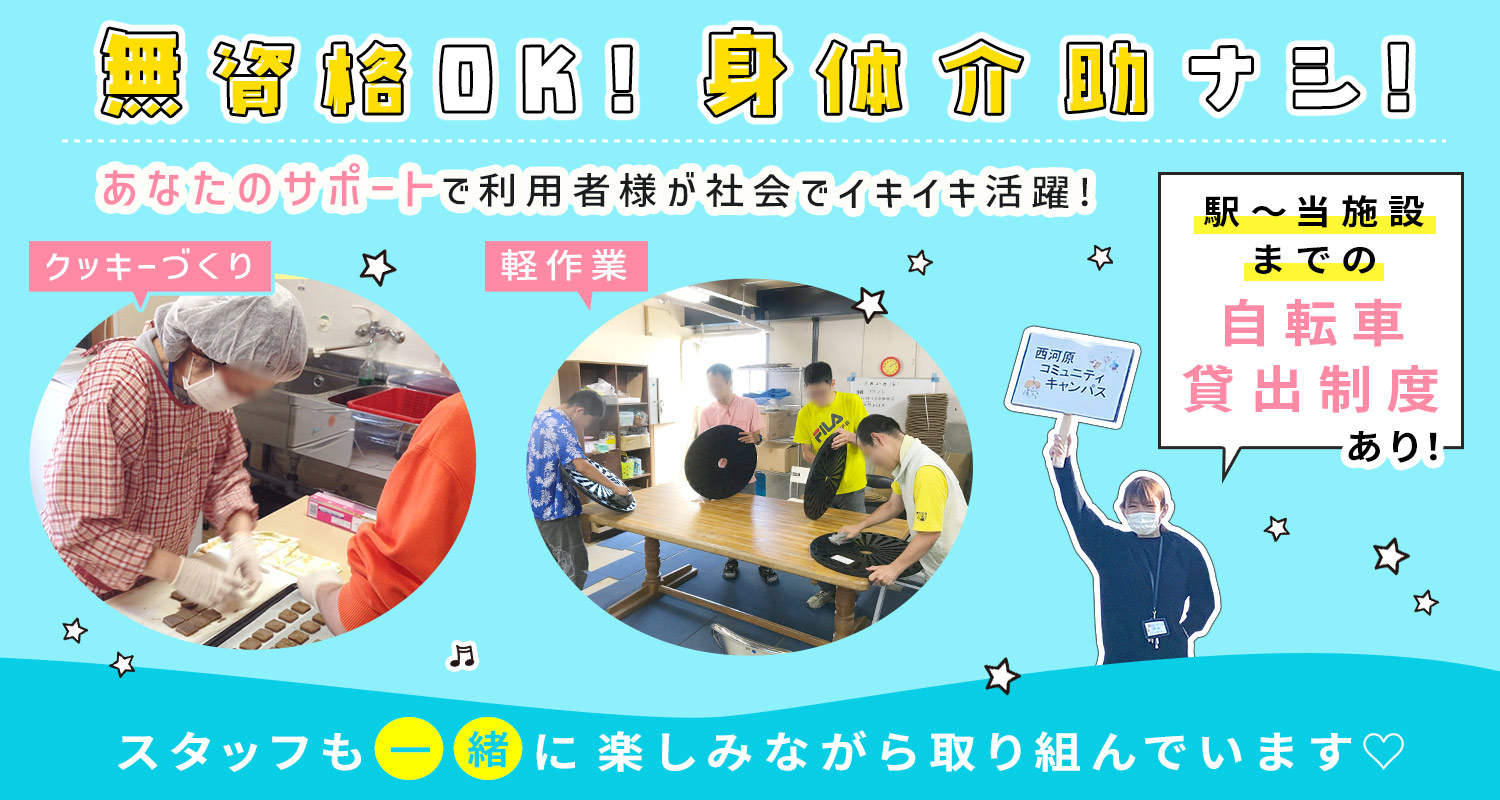 | 仕事内容 | 生活サポートスタッフ/シニアやミドルも歓迎[社] 障がいを持つ利用者様の身の回りの介助や日中活動の支援などをお願いします。※身体介助(入浴・食事介助)ほぼナシ ・日常生活上の身体機能・生活能力向上に向けた支援 ・BBQ、ウォーキング、ヨガなどの外部イベント参加 ・クッキーづくり、ポスティング、公園清掃等、生産活動のサポート など ★スタッフ全員で、利用者様一人ひとりの“一番”の応援団になる 『同じ目標に向かって、一緒に楽しみながら、一緒に取り組む。』それが私たちの考える福祉です。 たしかに障がいをお持ちの方には一人では難しいことがあったりします。 でも、できないと決めつけて代わりにしてあげるのではなく、 色々なことをチャレンジしていただくために、そっと見守るときもあります。 利用者様との関係を深めていく中で、嬉しい変化・成長を目にする瞬間がとても嬉しいです☆ |