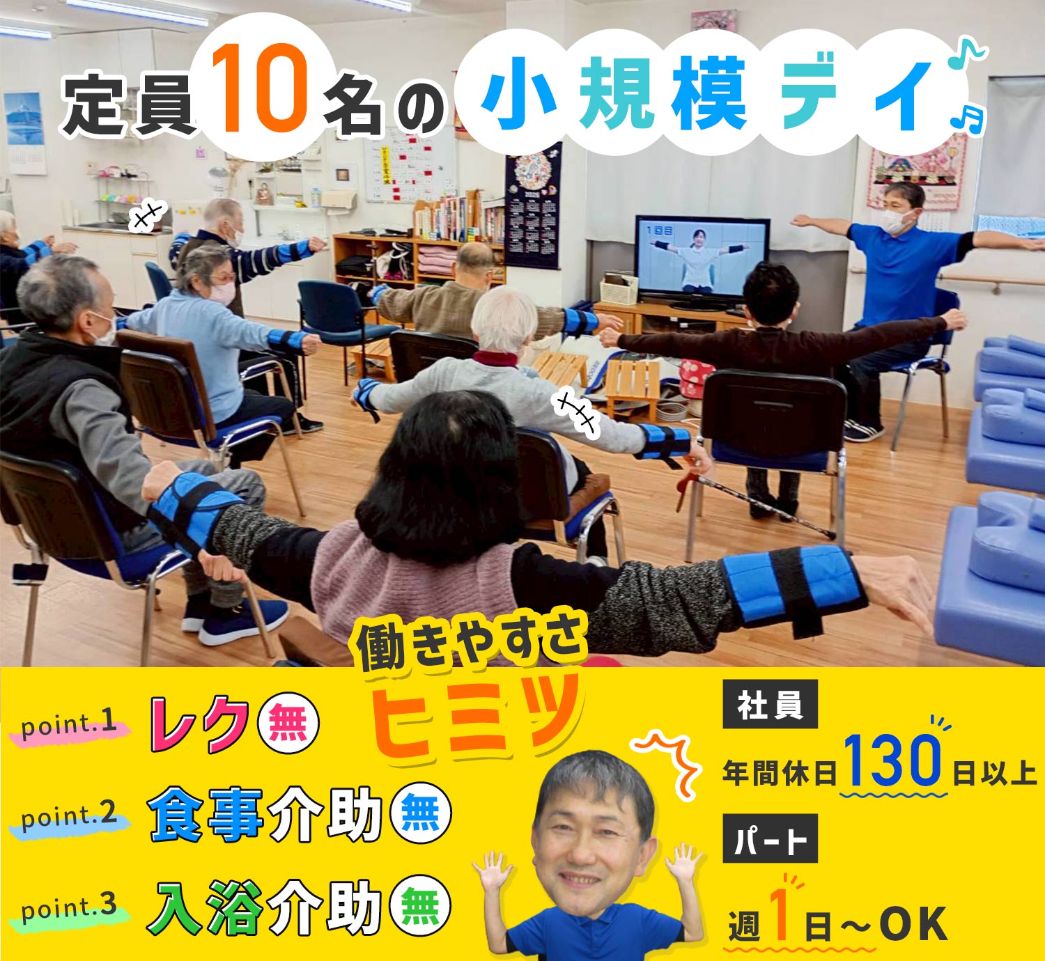 | 仕事内容 | 体操のサポート/介護福祉士・社会福祉士など[社] 機能訓練とリフレッシュを重視した半日型のデーサービスで 利用者様と一緒に体操をしたり、実施記録の記入、マッサージ機のセットなどをお願いします。 ※実施記録は手書きで2行程度記入するものです ※体操はストレッチを含む優しい内容ですのでご安心ください ※レクリエーションなし ※入浴・食事介助なし ※送迎なしOK ■午前の部、午後の部に分かれており、各回平均8名の利用者様が来所。 職員は常時4名以上と手厚い体制です。 ■利用者様は要支援~介護度1.5までのお元気な方が大半です。 車いすに乗っている利用者様はいらっしゃいません。 ■1日のスケジュール例 08:30 準備 09:00 利用者様来所 健康チェック、体操やリハビリの見守りサポート 11:45 喫茶タイム(お茶を出しています。介助なし) 12:30 午前の部終了 利用者様退所 13:30 利用者様来所 健康チェック後、体操やリハビリの見守りサポート 16:45 喫茶タイム(お茶を出しています。介助なし) 17:00 午後の部終了 利用者様退所 片付け 17:30 退勤 □□□ 送迎できる方は送迎も可能! 軽自動車で事業所周辺のみです。 |