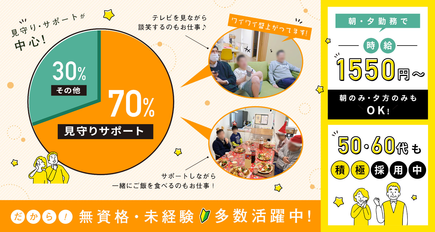 | 給 与 | 時給1590円~ ※経験・能力による ※処遇改善手当、資格手当含む ※賞与年2回あり ※試用期間6ヶ月あり(同条件) |