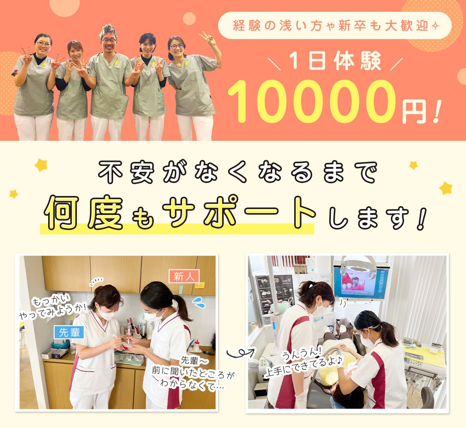 あなたの不安がスッキリ解決するまで、院長・先輩、誰に聞いても、何度聞いても優しく丁寧に教えます◎