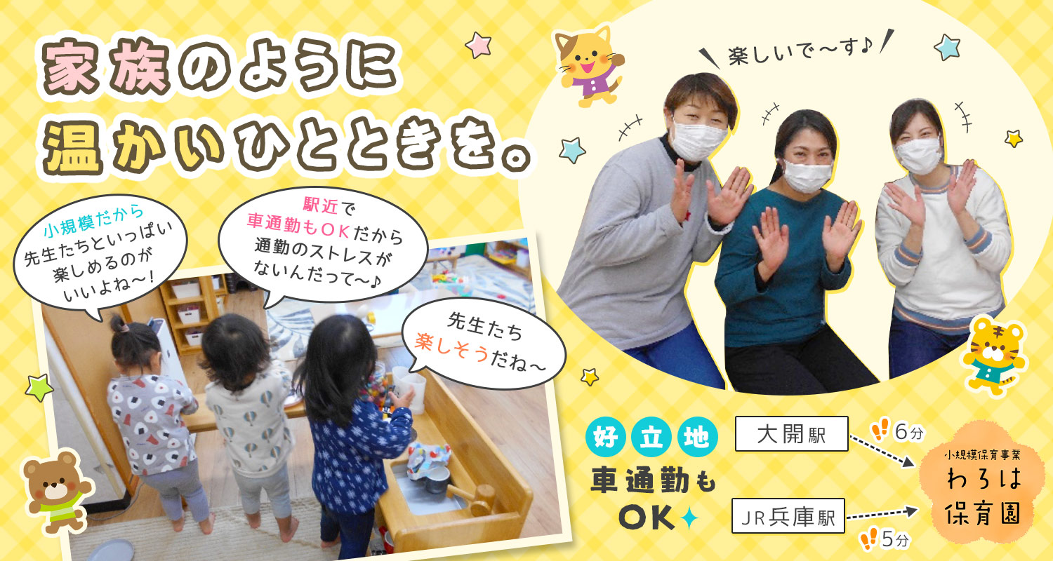 | 勤務地 | 兵庫県神戸市兵庫区羽坂通3-7-25/わろは保育園 |