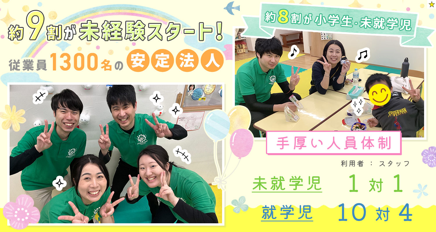 | 仕事内容 | (1)保育士[社] 保育士/週0日からOK[パ] (2)児童指導員/社会福祉士・教員等[社] 児童指導員/社会福祉士・教員等[パ] 曜日ごとに、児童発達支援事業と放課後等デイサービス事業を切り替えて行っております。 児童発達支援は未就学児を対象とした個別療育、放課後等デイサービスは就学児を対象とした集団療育の体制です。 ◆児童発達支援…1枠40分のマンツーマン療育を行います。 ◆放課後等デイサービス…1日の定員10名にスタッフ4名の体制。体操や宿題のサポート、フラッシュカードを実施したり、集団療育を行います。 ◇子どもたちと接するのは3時間半程度(平日) 午前は、落ち着いて療育の準備や事務作業にあてていただけます。午後も実際に子どもたちと接する時間は短めのため身体への負担も少ない環境です。 ※[パ]パートの方には会社が定める各研修に参加いただきます(月1回+年3回、その他)。この際の給与は一律時給1280円~となります。 |