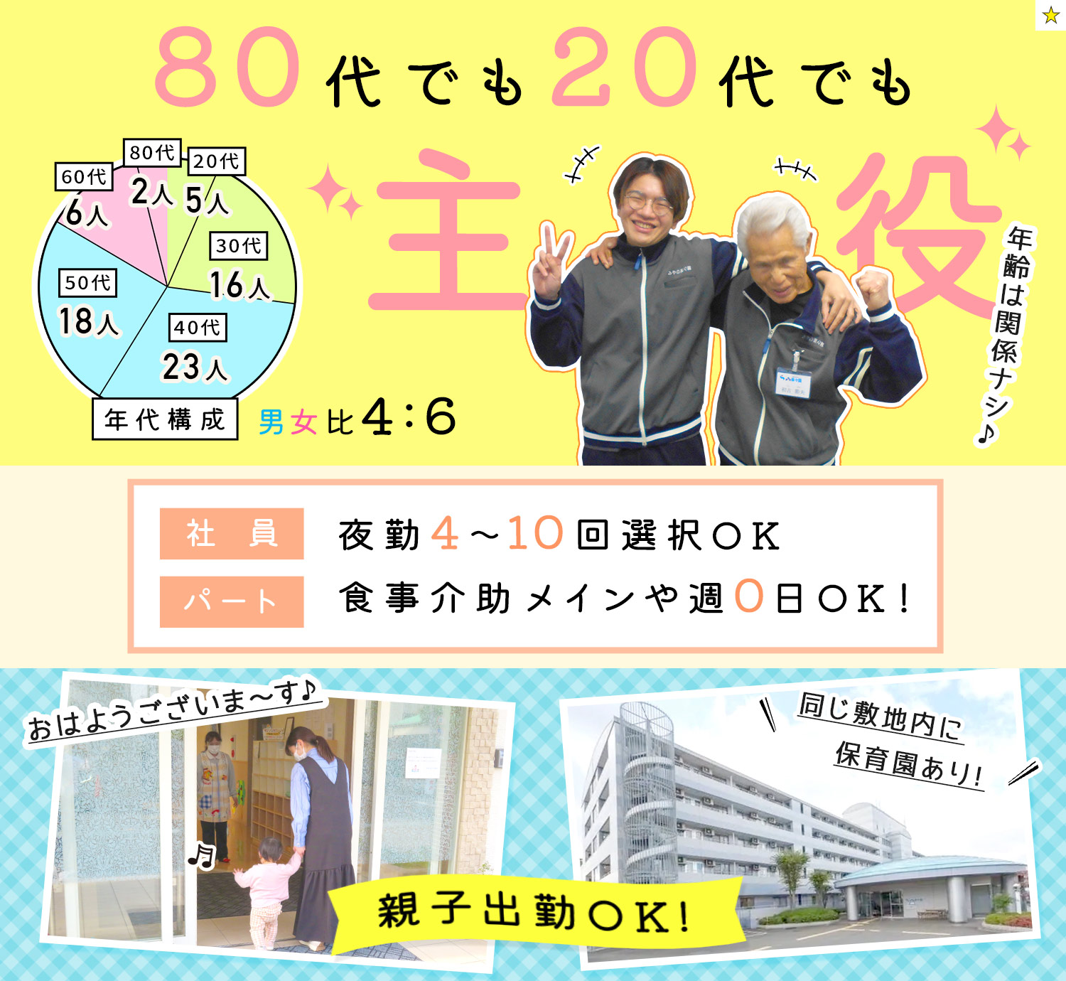 | 給 与 | (1)月給25万6800円~29万7550円 (2)月給23万円~27万7550円 (3)月給22万1850円~26万7850円 ※経験加算あり(これまでの介護職経験を評価。ブランクある方も対象) ※夜勤手当5回分(1回7000円)、処遇改善加算含む ※夜勤回数4回~10回選択OK <収入例> 月収29万6800円 (介護福祉士/既婚・子供2人の場合) ※住宅手当(2万円)・家族手当(2万円)含む ※試用期間3ヶ月(同条件) |