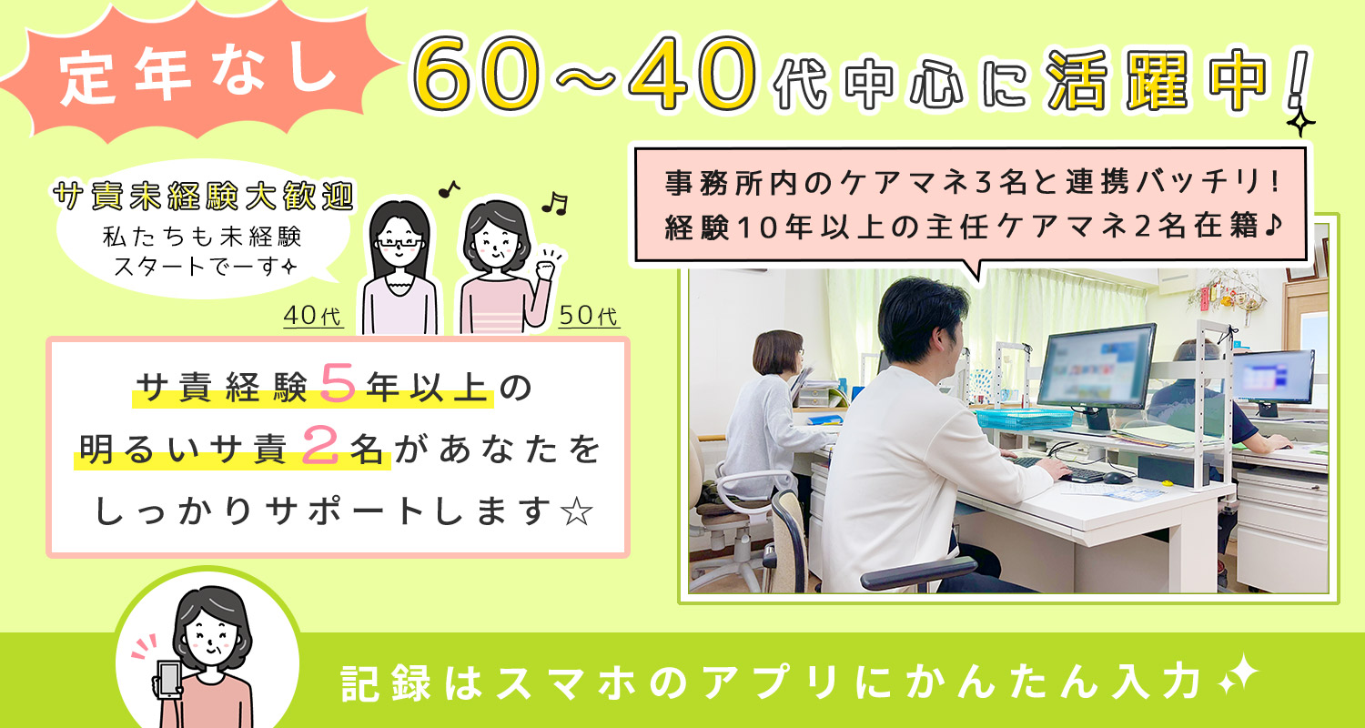 | 応募資格 | 要介護支援専門員 #ブランクOK ※実務未経験OK ※主任介護支援専門員は優遇 ※年齢不問!シニアやミドルも歓迎 |