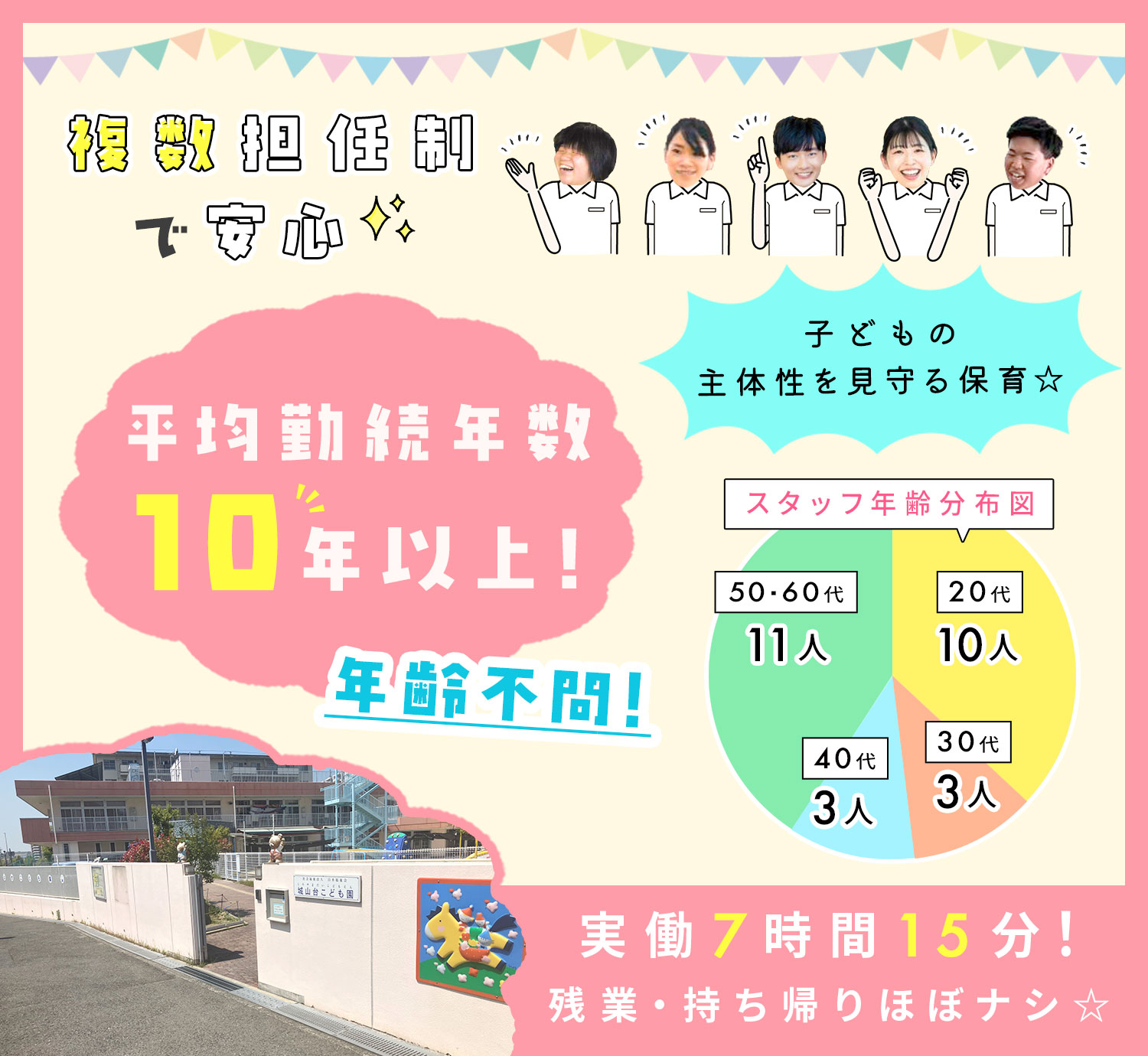 | 応募資格 | 保育士資格および幼稚園教諭免許お持ちの方 #ブランクOK ※実務経験不問 ※年齢不問!シニアやミドルも歓迎 ※男女不問(男性保育士も4名活躍中!) |
