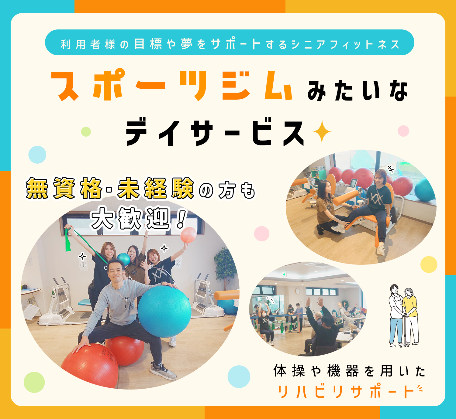 | 仕事内容 | (1)介護福祉士・リハビリトレーナー[社] (2)無資格OKのリハビリトレーナー・介護職[社] リハビリ特化型のデイサービスにて、 利用者様(30名ほど)の運動をそばでサポートしていくお仕事です。 利用者様への運動指導やトレーニングのサポート、歩行時の付き添いなどの介助をお願いします。 ※リハビリに関する知識は不問 ※個別リハビリ、マシントレーニングを行っています 【1】マシンの使い方の説明、トレーニングのサポートを行います。 【2】バランスボールを使って、身体機能の維持・改善のサポートを行います。 【3】利用者様の送り迎え、入浴・トイレの介助などを行います。 ※午前の部、午後の部の入れ替え制 ※入浴介助もありますが、個浴型介護浴槽のため介助者の負担は少なめです。 ※送迎なしOK(専属の送迎ドライバーがいます) ※送迎できる方は送迎ありもOK |