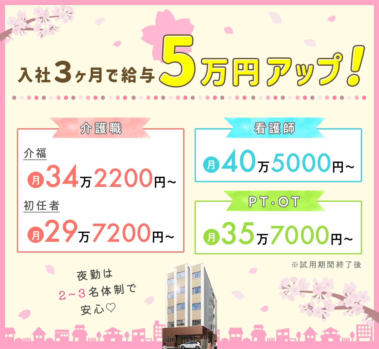 試用期間終了後、介護福祉士なら5万円昇給で、『月給34万2200円』