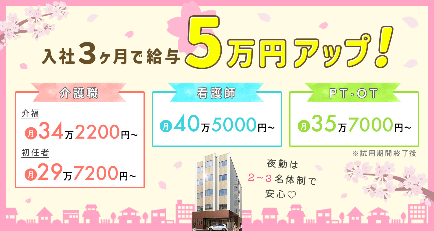 | 給 与 | (1)月給34万2200円~40万4800円 (2)月給29万7200円~31万9800円 ※実務者研修修了者は月給30万2200円~ ※処遇改善手当、ショート夜勤手当2回分(1回7100円)、深夜割増加算含む <収入例> (1)入社2年目/年収479万円~ (2)入社2年目/年収416万円~ ※試用期間6ヶ月(3ヵ月など期間短縮の場合あり※実績あり) (1)月給29万2200円 (2)月給27万2200円 ※実務者研修修了者は月給27万7200円 |