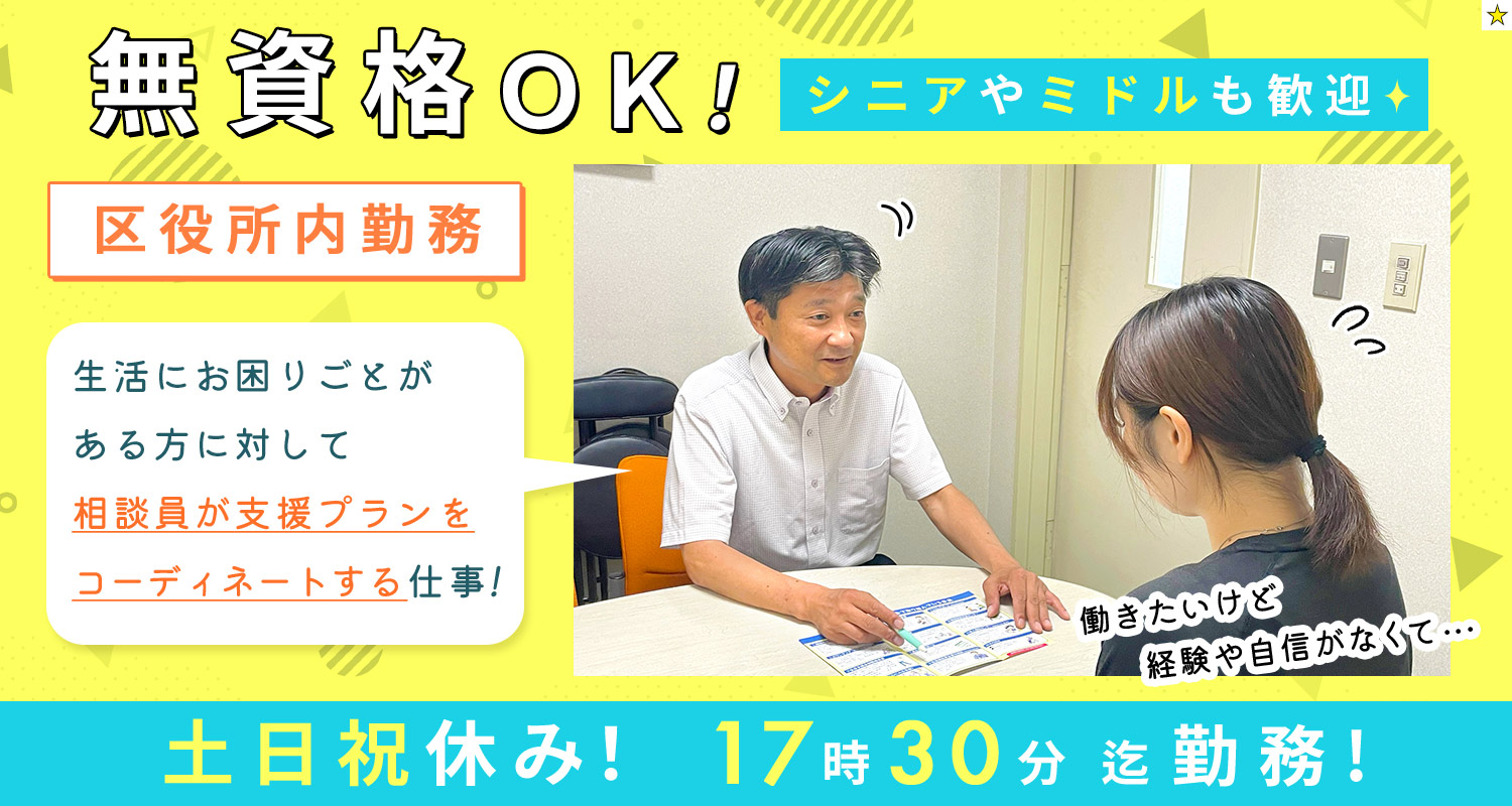 | 応募資格 | 無資格・未経験OK ※相談業務の経験不問 ※ブランクOK ※基本的なパソコン操作ができる方(Word、Excelなど) ※男女不問!シニアやミドルも歓迎 ※自転車に乗れる方 ※以下いずれかの資格・経験をお持ちの方は優遇 社会福祉士、精神保健福祉士、社会福祉主事任用資格(相談支援経験は不問) 福祉関係の相談支援業務の経験が2年以上ある方 #ブランクOK ※契約社員:契約期間1年/原則更新/年齢上限なし |