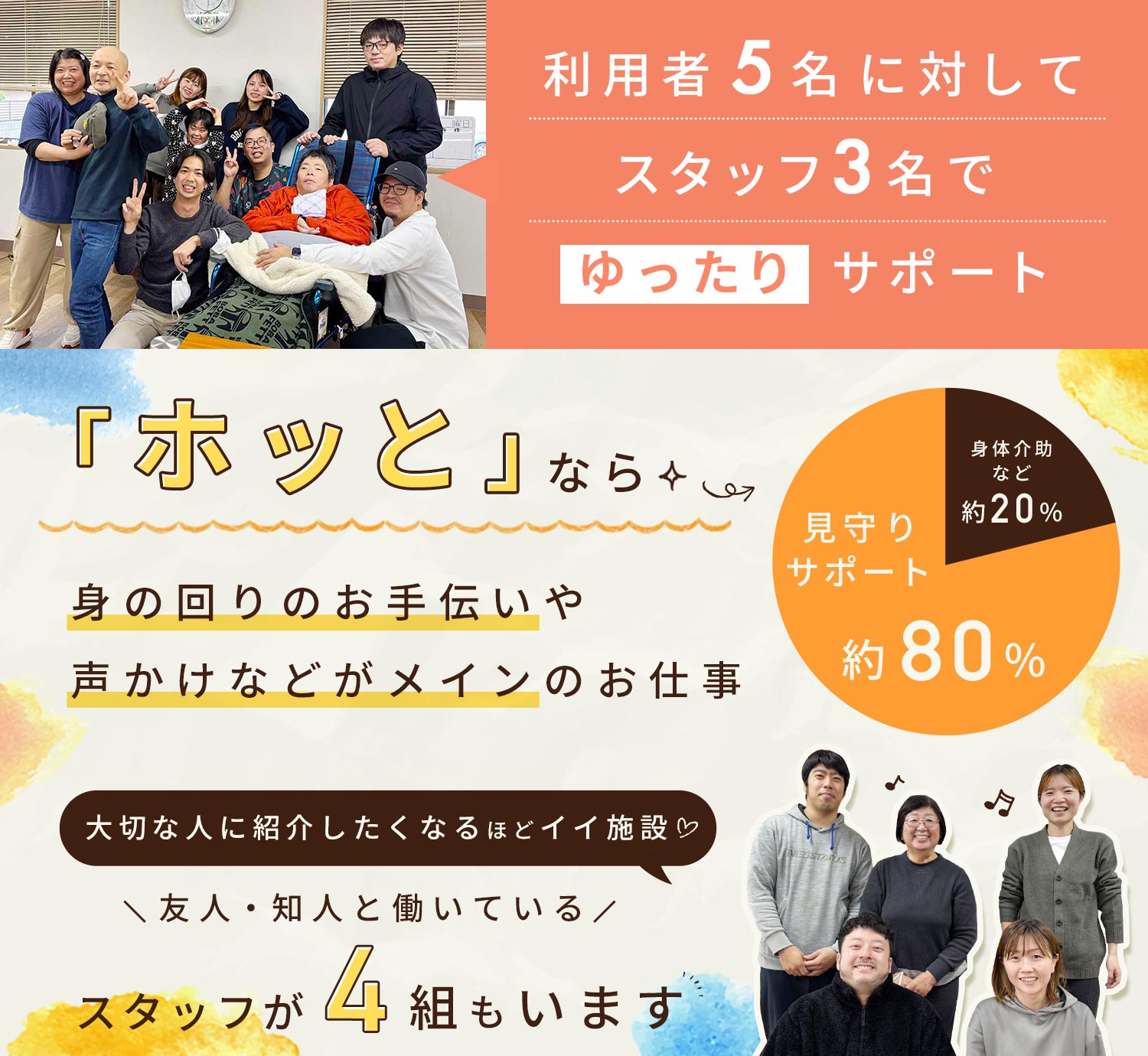 利用者様5名に対して、基本3名のスタッフサポートしますので、少人数でじっくり関われます◎