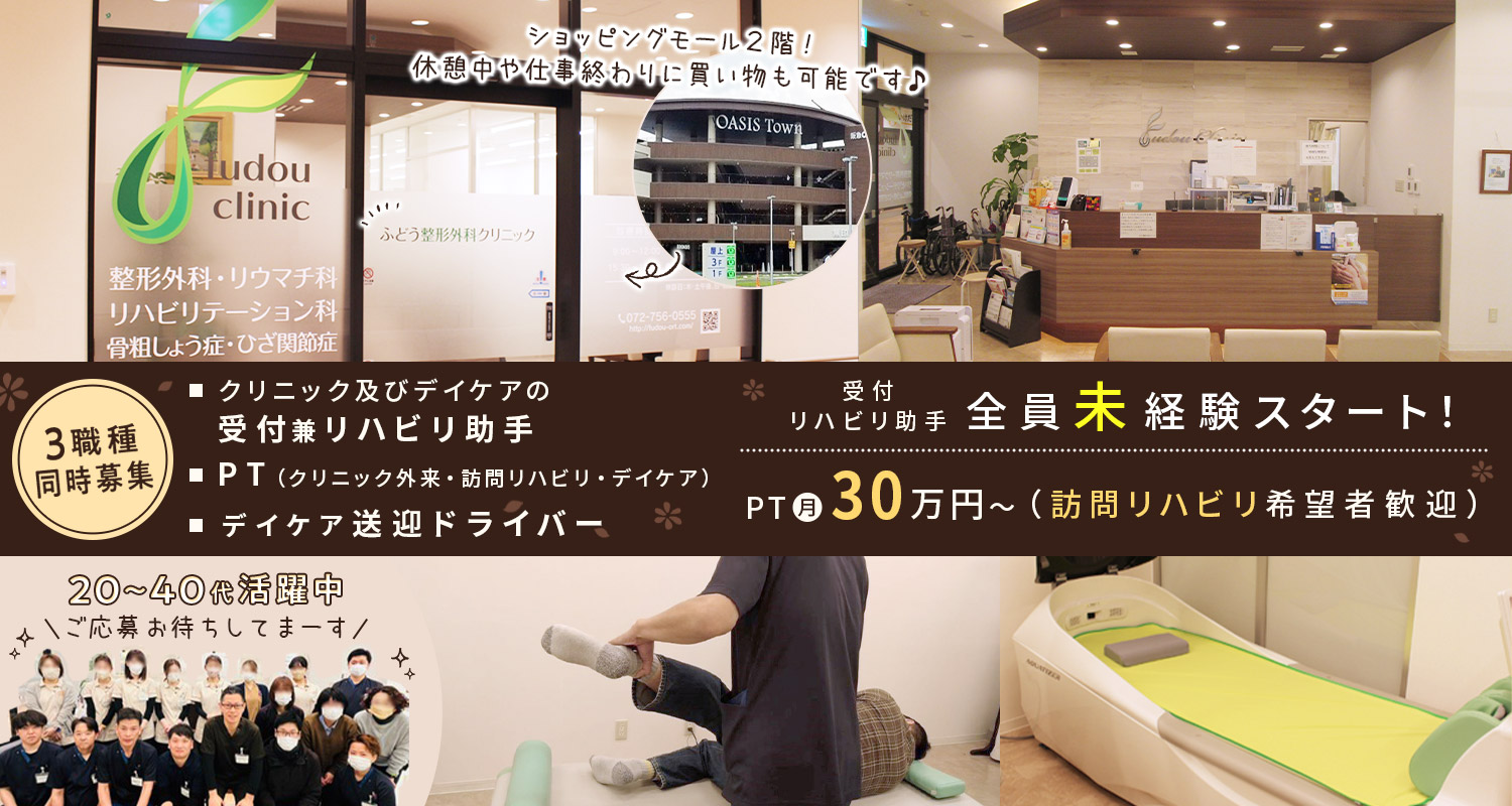| 仕事内容 | (1)クリニックの事務受付兼リハビリ助手[社] 整形外科クリニックの事務受付兼リハビリ助手業務、および関連する管理業務全般。 (2)デイケアの事務受付兼リハビリ助手[社] 整形外科クリニックの事務受付兼リハビリ助手業務、および関連する管理業務全般。 ・オープン準備 ・受付対応、電話対応 ・患者様の誘導等のリハビリ助手 ・レセプト業務、会計、データ入力など ※経験スキルに合わせて丁寧に指導いたします。 ※スキル向上に合わせて仕事をお任せしていきます。 □□□ 【院長先生からもメッセージ】 ふどう整形外科クリニックはおかげさまで7年目に入りました。 地域に愛され頼られるクリニックとして地道に進んできましたが、これからも安心で満足できる質の高い医療の提供に努め、地域の”かかりつけ医”を目指します! そして、より多くの患者様にお応えするため、スタッフを募集します。 ◆キャリアアップ制度導入、スキルに合わせて研修を実施していきます! ◆面談制度を設け、不明や不安なことは気軽に聞けます! ◆年3回以上(年末年始・GW・お盆休み・シルバーウィーク等)長期休暇実績あり! 働きやすい環境を整えていますので、ぜひ一緒に患者様のサポートをしていきましょう。 |