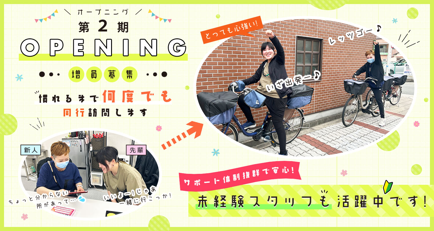 | 仕事内容 | 訪問看護師・土日休み/2025オープン[社] 精神科に特化した訪問看護業務全般。 訪問は1回30分のサービスが多いですが、大半の時間は患者様とのコミュニケーションです。 ※基本身体介助なし ◆訪問中の流れの一例(30分の場合) 最近の出来事や、困っている事を伺ったり、日常会話(20~25分) 「最近ちょっと体型が気になってて…」→一緒に動画を見て運動 「最近歩くのが辛くて…」→一緒に歩く練習 その後、バイタルチェックや服薬管理(5分程度) ※直行直帰OK ※訪問は1日4~5件程度 ※移動手段は電動自転車(貸与あり) ◆最初は研修からスタート 入職後はまず、3日間程度の座学研修を実施。精神科未経験の方はさらに研修あり。 その後、先輩と一緒に訪問し、現場での業務の流れを学びます。 同行訪問については新人さんと患者様の信頼関係ができるまで、何度でも行いますのでご安心くださいね◎  |