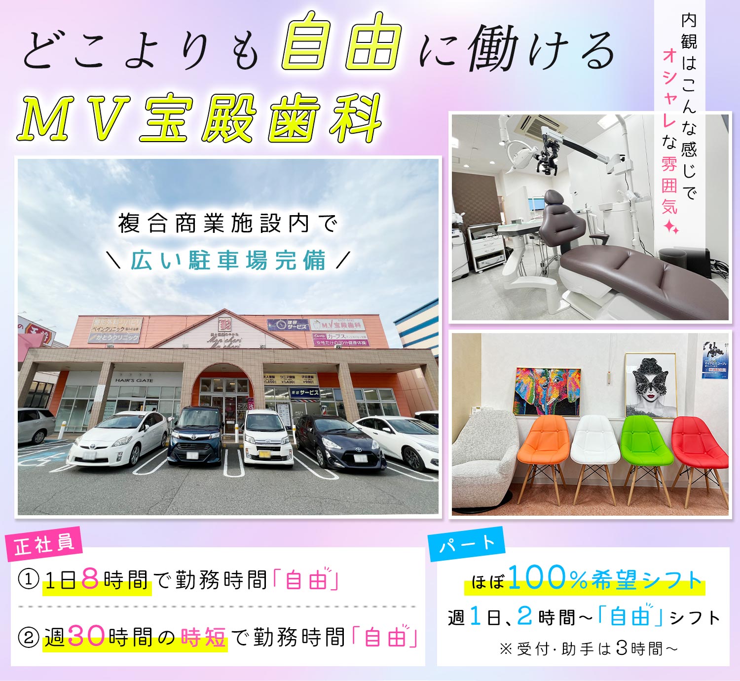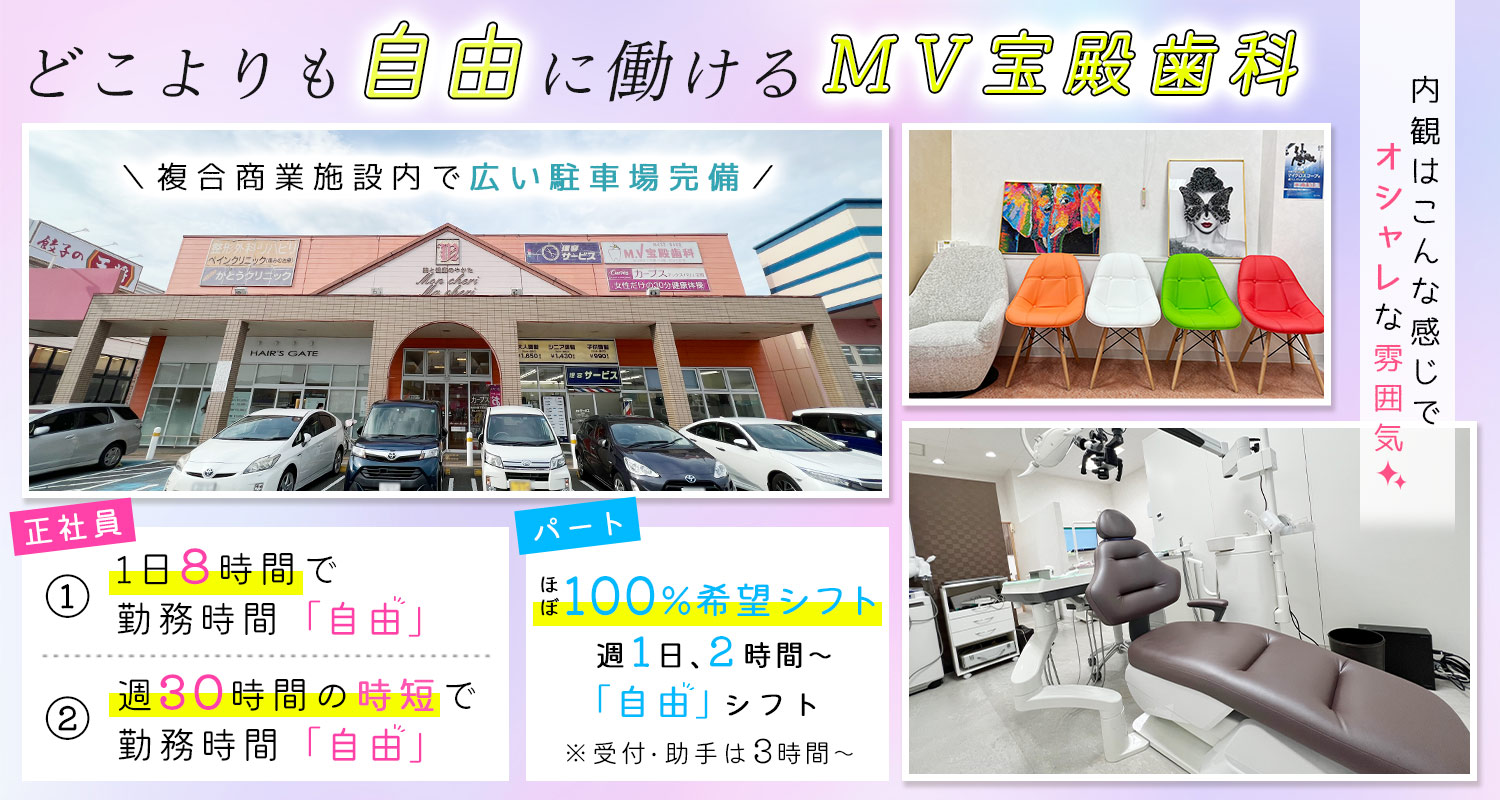 | 勤務時間 | [午前診]10:00~13:00 [午後診]14:30~21:00 ※上記時間内で、1日8時間の自由シフト(休憩90分) <シフト例> 10:00~19:30、11:00~20:30など ※『オーダーメイドシフト』時短正社員もご相談ください! 10:00~17:30(休憩90分) 10:30~18:00(休憩90分) 10:00~13:00、17:00~20:00 など、曜日によって勤務時間も自由に設定OK!  |
