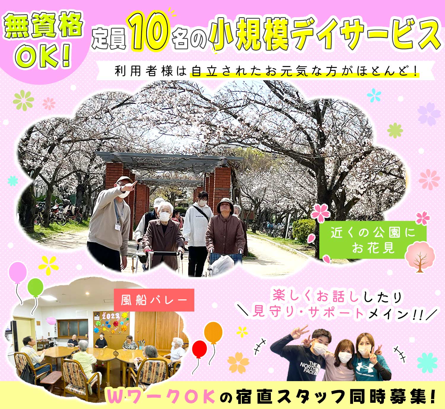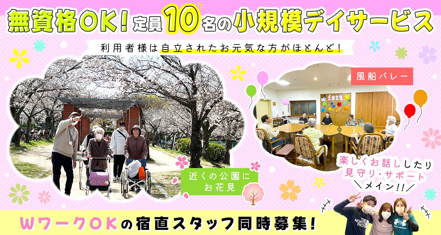 | 仕事内容 | パートの介護職/軽作業や事務等から転職OK[パ] デイサービスでの介護職全般。 自立されている利用者様が多いため、身の回りのサポートや見守り・お話し相手になったり、施設内の清掃、レクリエーションの企画実行などがメインです。 10名の利用者様に対し、スタッフ3~4名で対応しています。 ※送迎業務ナシ <1日の基本的な流れ> 10:00~10:30 利用者様のお迎え、健康チェック 10:30~11:40 体操、レクリエーション 13:00~15:00 入浴補助(3名の利用者様を2名のスタッフでサポート!ゆったり安全に入浴して頂いています。) 15:00~16:00 コーヒーブレイク・レクリエーション 16:00~16:45 デイサービス終了後、室内の掃除 |
