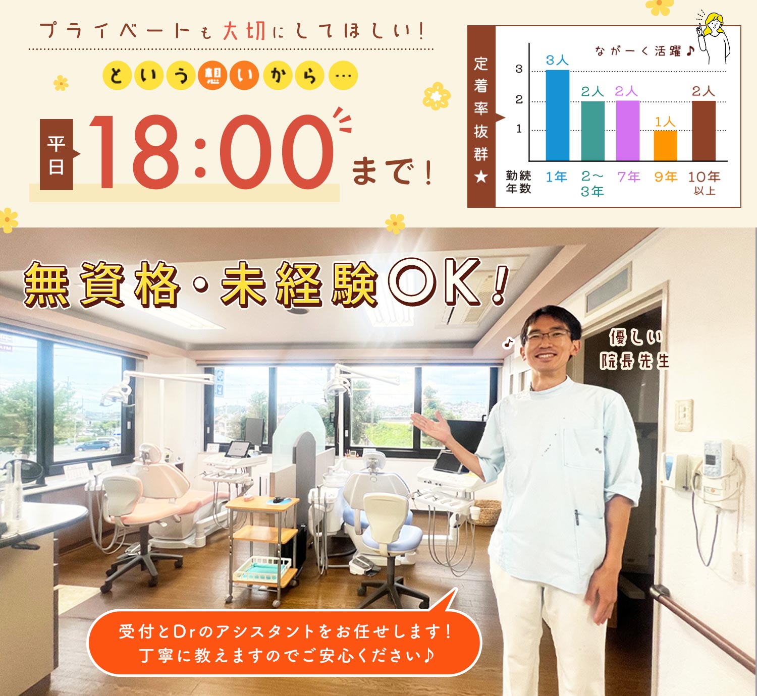 | 待 遇 | #入社祝い金あり (5000円)※入社3ヶ月後に支給 #昇給あり 歯科医師国保・労災保険・雇用保険 ※勤務時間による 交通費規定支給 #車通勤OK、バイク通勤OK(無料駐車場有・ガソリン代支給) スタッフルーム完備 研修・セミナー費用補助あり 制服貸与 ネイルOK(業務に支障のない範囲で) 髪型・髪色自由 正社員登用あり |