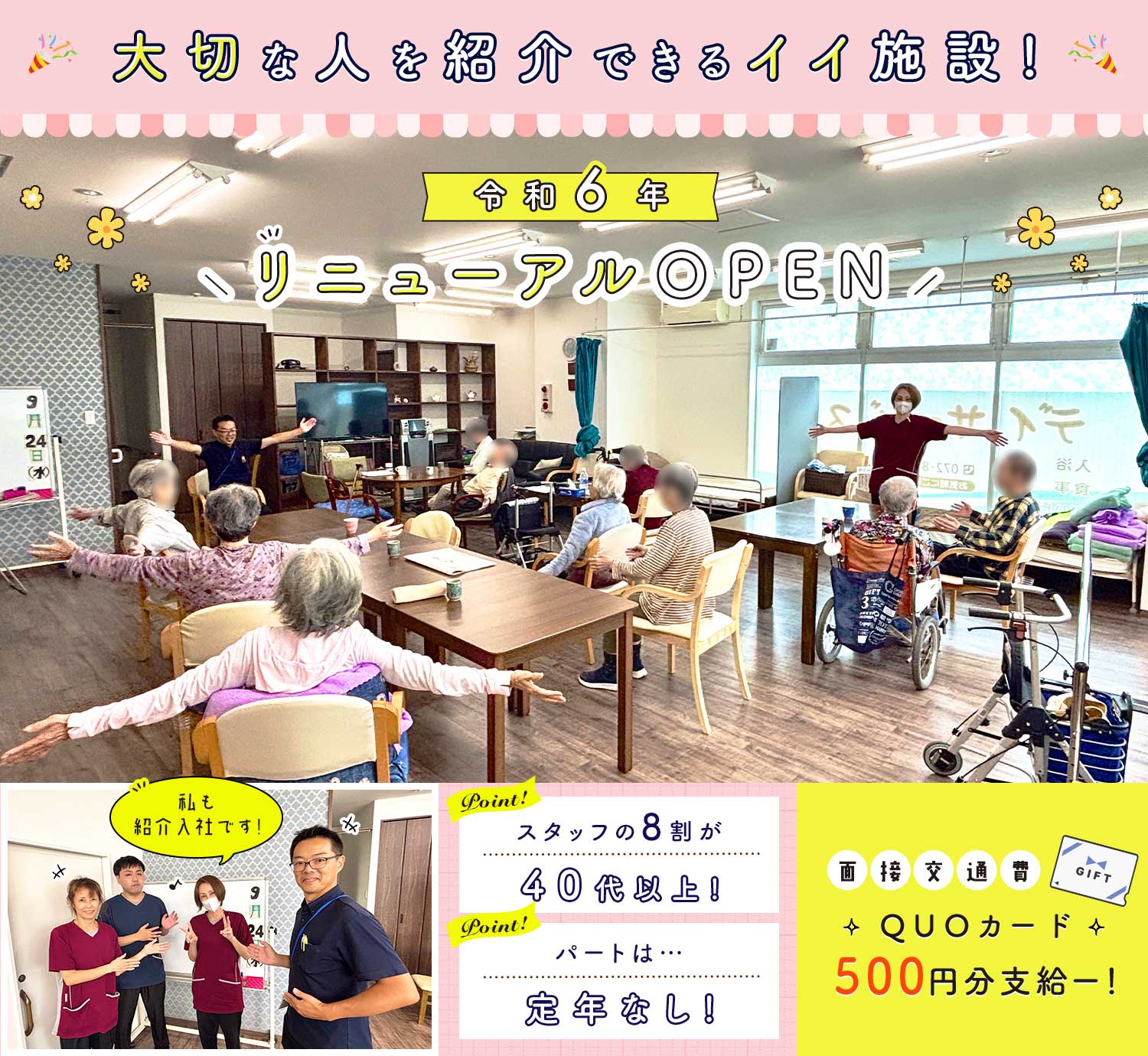 | 仕事内容 | パートの介護職/シニアやミドルも歓迎[パ] 令和6年リニューアルOPEN、定員20名のデイサービスでの介護業務。 入浴や食事など身の回りのお世話。レクリエーションの企画・実施。その他、健康チェック、リハビリ補助など介護業務全般をお願いします。 ※送迎できない方もOK! 送迎できる方でも、運転する距離は片道10分圏内がほとんど(遠い場合でも片道16分程度) 1人あたり6~8名の送迎で、車種はN-BOX・パッソ・ビッツ ◆体操・機能訓練に注力 機能訓練は専門の指導員が中心となって行うので、介護職員は利用者様と一緒に身体を動かす体操などを担当☆ ◆レクリエーションも活発な施設 季節に合わせて、かき氷やおはぎ、お赤飯を食べたり、たこ焼きパーティーなど、食事を楽しむレクリエーションが特に人気! 毎月のお誕生日パーティ、七夕やバレンタインなど、定期的にみんなで楽しめるイベント・季節行事も大切にしています。 タブレットに様々なレクリエーションがあるので、スタッフが一からレクリエーションを考える負担は少ないんですよ◎ |