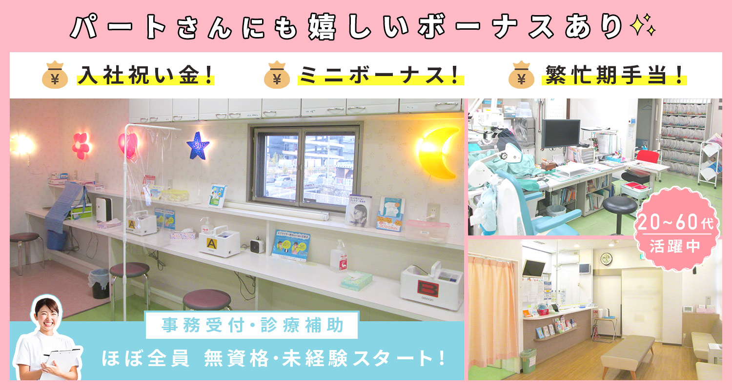 | 仕事内容 | 事務受付・診療補助/バイト・パート[パ] 受付・医療事務業務および診療のサポート。 ・来院された患者様の受付およびお会計 ・患者様の誘導や小さなお子さんの介助 ・レセプト業務(レセコン入力) ・診療の準備 ・診療器具の洗浄 ・聴力検査などかんたんな検査業務  |