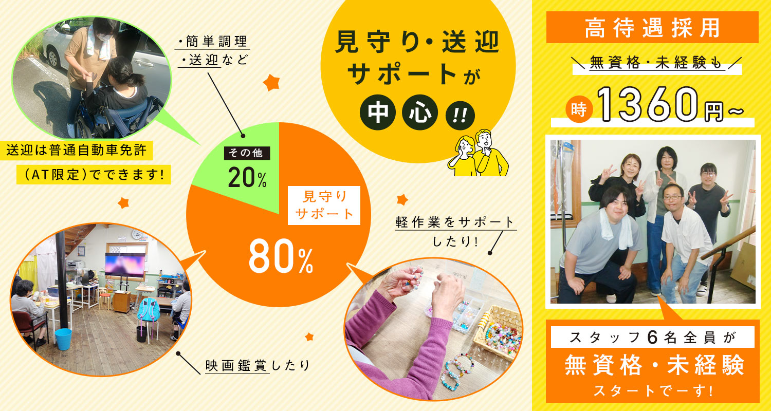 | 仕事内容 | 生活支援員・介護/パート・バイト[パ] 障害を持つ方が日中に通う生活介護事業所での支援業務。 ・日常の見守り・生活サポート ・かんたんな調理と配膳 ・施設内の掃除 ・行事やイベントの企画および準備 ・記録など事務作業 ・車両による送迎※普通自動車免許は必須です。 ◆1日のスケジュール例 08:30 出勤、送迎(1~2件) 10:00 メンバーさんの自由時間の見守り(テレビやトランプなど) 11:40 昼食準備、昼食、水分補給サポートなど 13:00 自由時間の見守り、軽作業を行うメンバーさんの見守り 15:00 自由時間の見守り 16:00 送迎 17:00 清掃、翌日の準備 17:30 退勤 ※昼食準備は炊飯やインスタントのみそ汁作り、冷凍弁当(クックチル)をスチーマーに入れるだけなど簡単なものばかりで、調理が苦手でも全く問題ありません! ※軽作業やビーズを使った創作、革のアクセサリー作成など様々なことに取り組んでいます! ◆人生を豊かにするお手伝い 中には10年以上通ってくださる方もおり、当初は感情の起伏が激しかったのがウソのように穏やかに話せるようになったり、長く引きこもりだった方は通所をきっかけに一人暮らしを目指すようになったり、驚くほどの変化を見せるメンバーさんもいます。 私たちが関わっていくことでメンバーさんの人生をもっと豊かにしていけるようみんなで取り組んでいけるところがこの仕事の醍醐味です☆ |