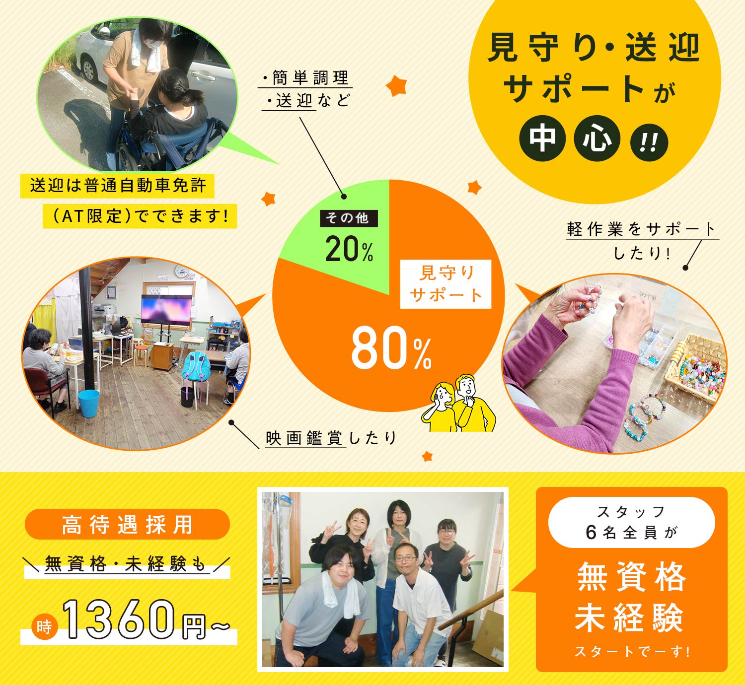 | 応募資格 | 無資格・未経験OK ※普通自動車免許(AT限定可)は必須となります!/7人乗りの車(ノア)で送迎業務あり #ブランクOK □□□ ※介護職員初任者研修修了者などの有資格者は尚可 ※シニアやミドルも歓迎 ※学歴不問 ※正社員登用あり 長期で勤務し、将来的には正社員として活躍してくれる方歓迎! |