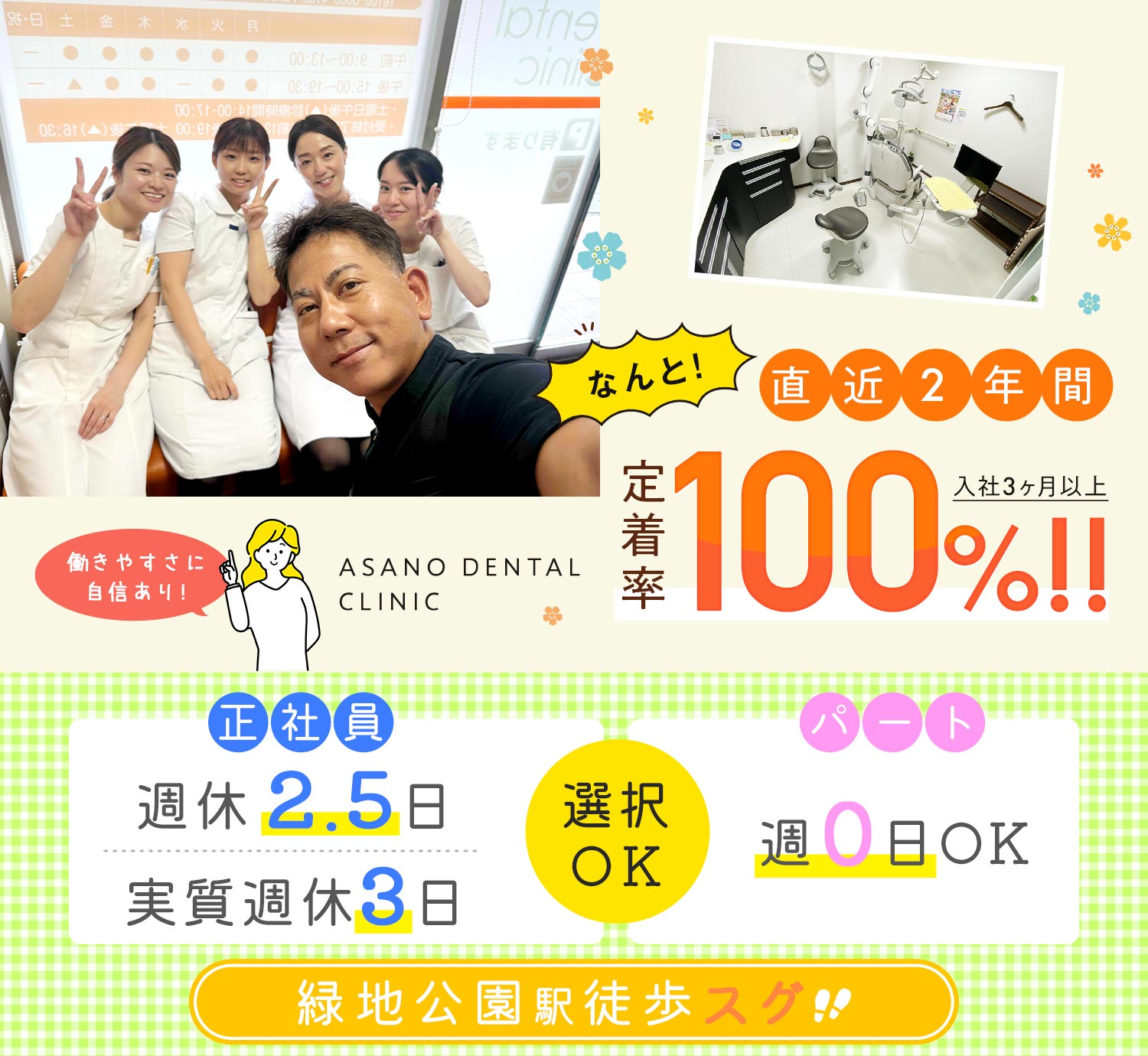 | 待 遇 | #昇給あり 年1回 ※規定あり 交通費規定支給 歯科医師国保※規定あり 雇用・労災※法定通り スタッフルームあり 個人ロッカー・更衣室あり 制服貸与(1~2年毎に新しい制服に入れ替えています)  |