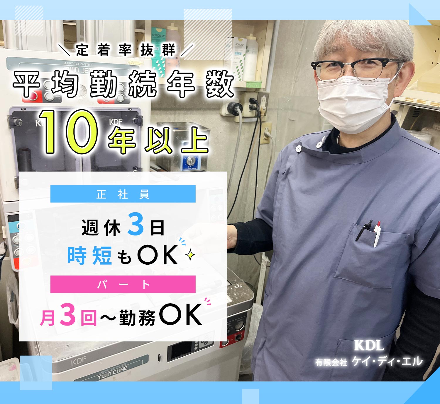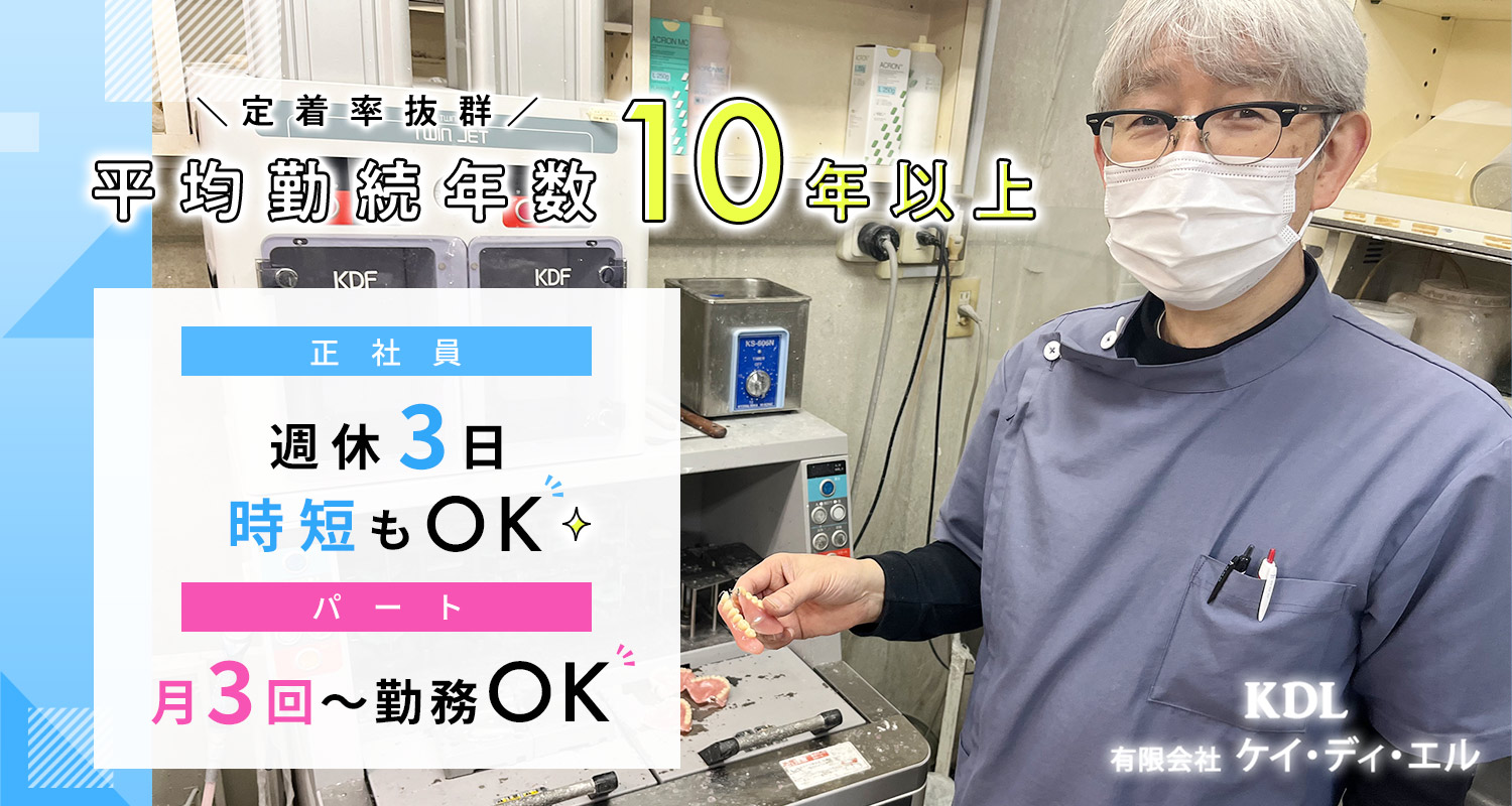 | 仕事内容 | 歯科技工士/月に3日からOK[パ] 当社では保険適用の技工物全般を取り扱っており、 今回は、部分入れ歯や総入れ歯などの技工業務全般をお願いします。 主に、重合・研磨・配列を担当してる正社員のサポートをお願いします。 |