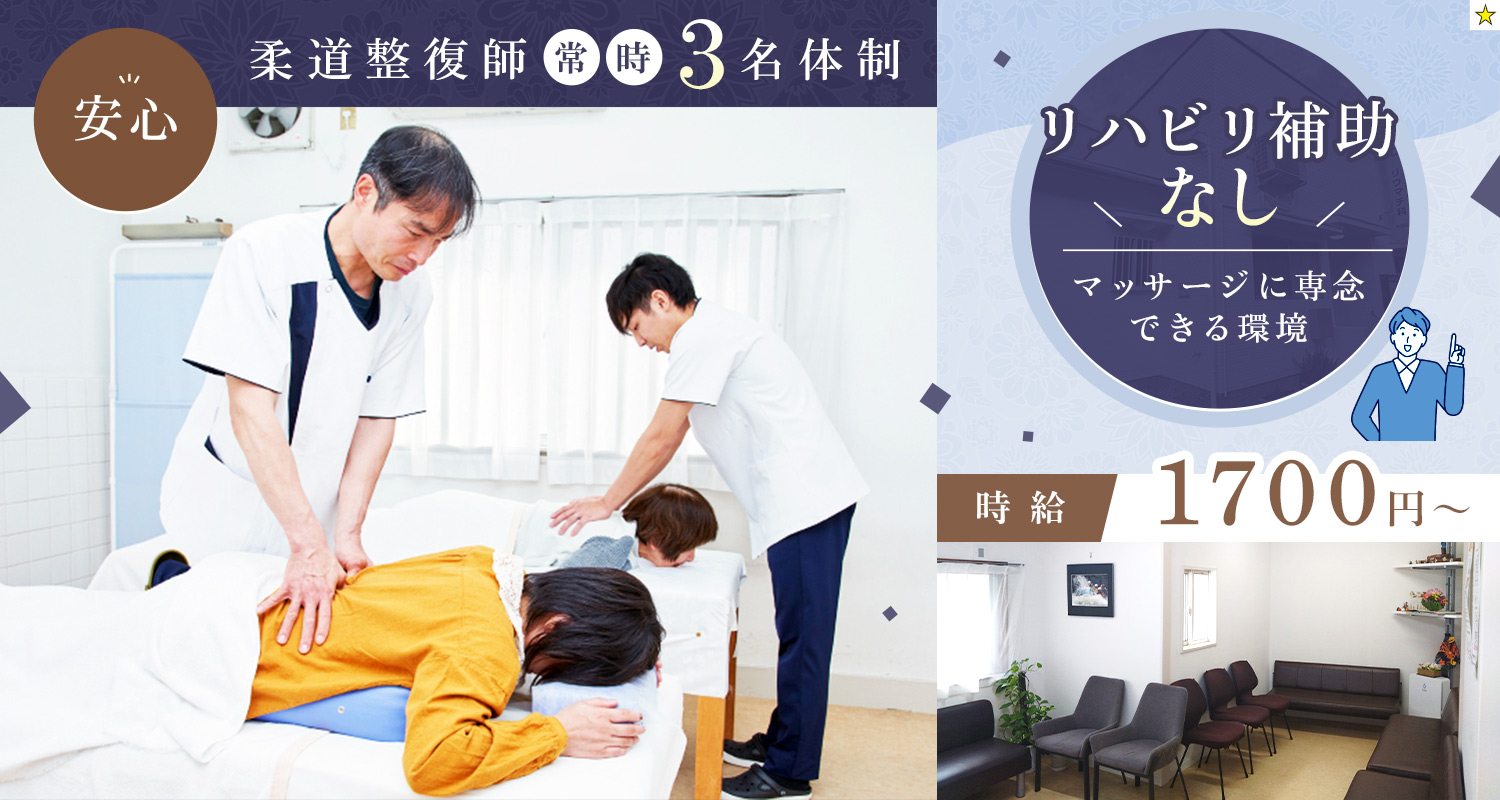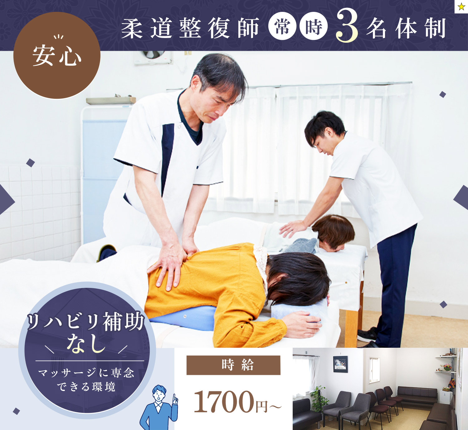 | 応募資格 | 柔道整復師 #ブランクOK ※経験年数不問 ※副業・WワークOK ※午前勤務できる方歓迎 |