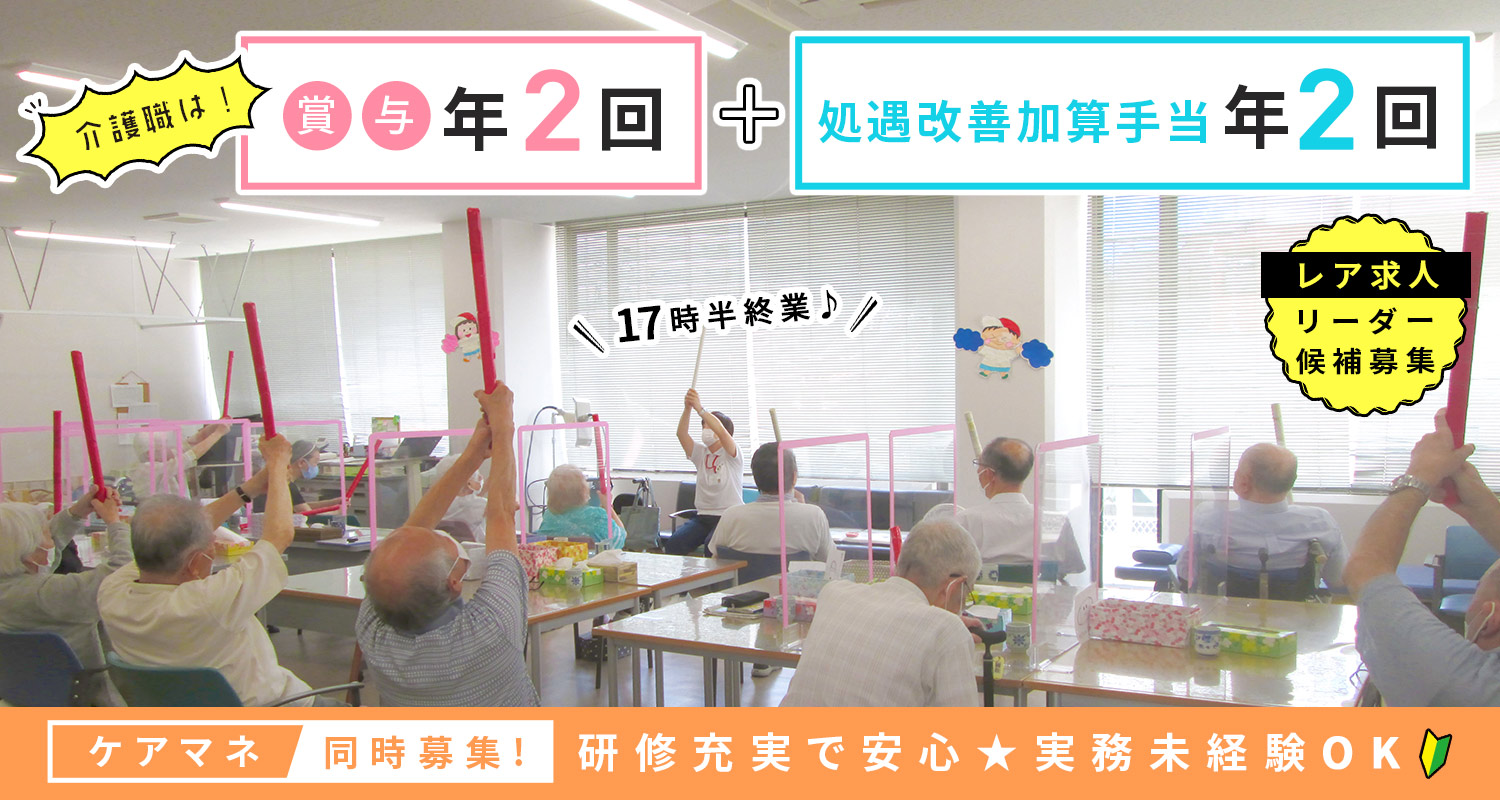 | 仕事内容 | (1)介護/夜勤なしの介護職[社] (2)夜勤なしの介護職/リーダー候補[社] (1)デイケアでの入浴や食事など身の回りのお世話。その他、健康チェックなど介護業務全般 (2)デイケアでのリーダー業務 早ければ入社3か月後からリーダーになっていただき、 スタッフのシフト作成や管理、業務の指導をしていただきます。 <スケジュール例> 08:30 送迎(できる方) 健康チェック 入浴など 10:30 朝の会 体操 個別リハビリ 11:20 口腔体操 11:30 昼食 休憩 13:30 グループ体操 個別リハビリ 15:00 おやつ 15:25 体操・送迎(できる方)  |