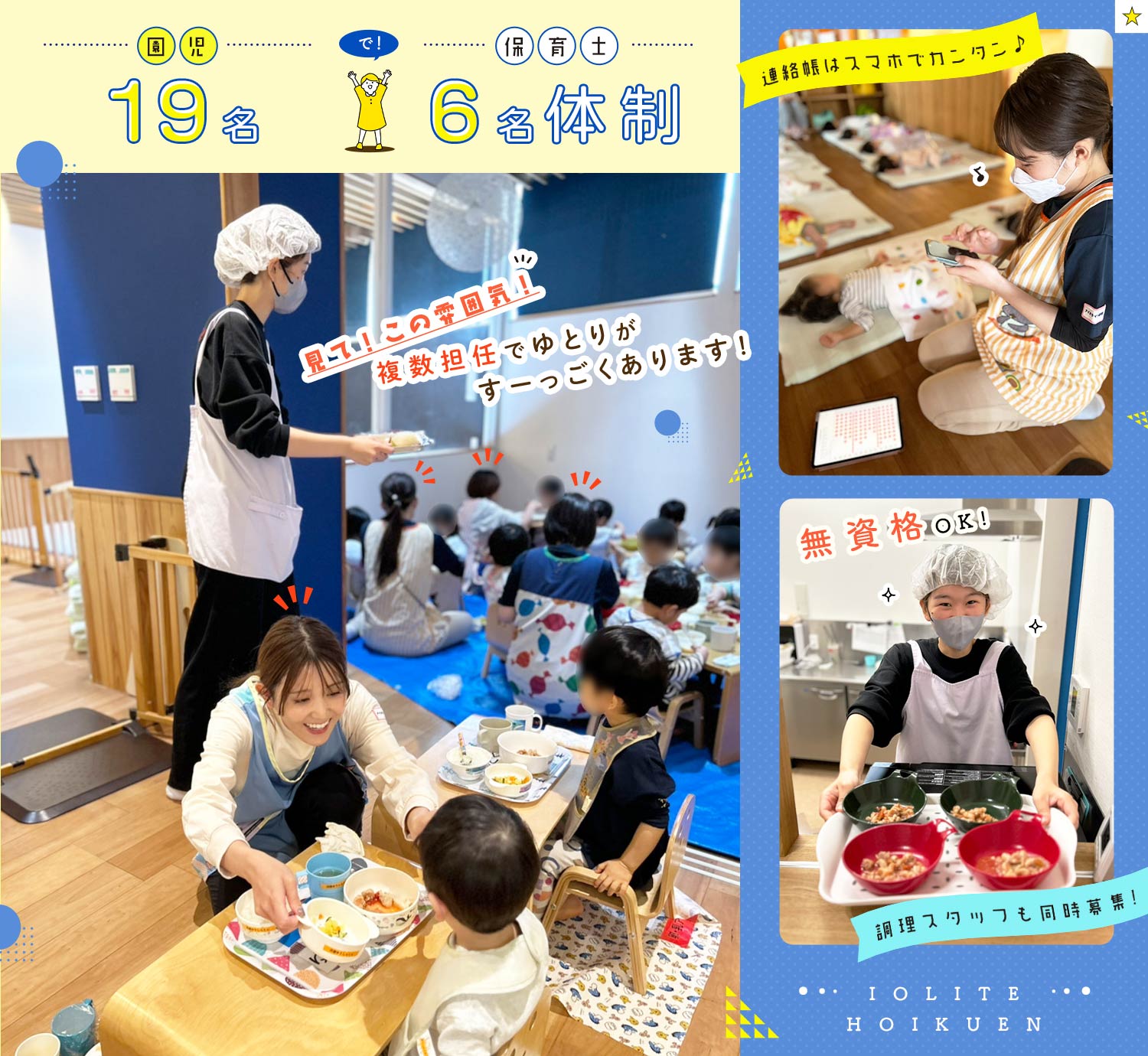 0~2歳の最大19名の園児に対し、保育士5~6名+保育補助の体制!