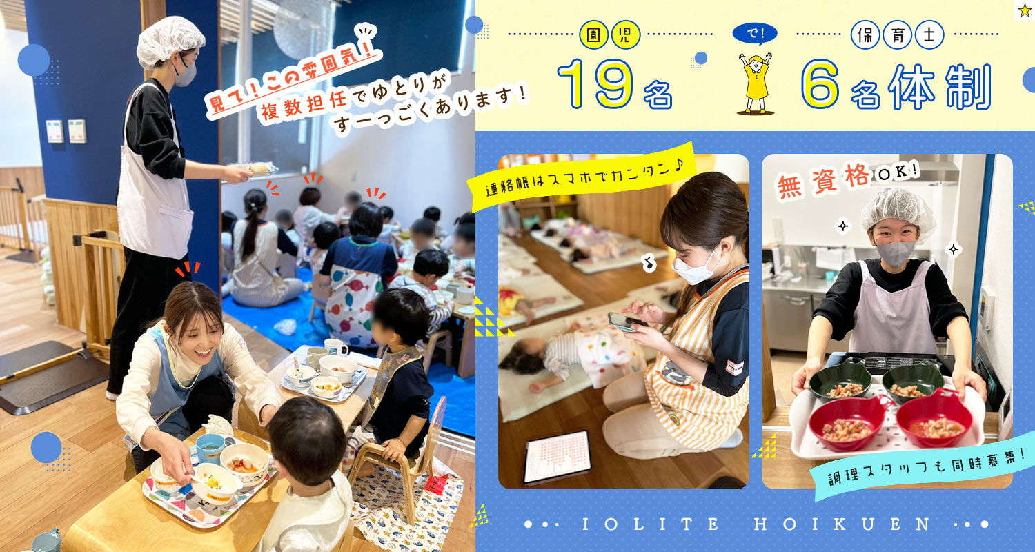 | 仕事内容 | 保育士[社] 0~2歳の園児(定員19名)の身の回りのお世話、日常生活や遊びを通じた心身の発達サポート、連絡帳の記録、保護者と職員間のコミュニケーション対応など、保育業務全般をお願いします。 ◎ピアノがひけなくてもOK! ◎連絡帳はアプリで管理!事務作業の手間を削減しています! ◎担任制ではないので、みんなで助け合いながら園児をサポートしましょう!  |