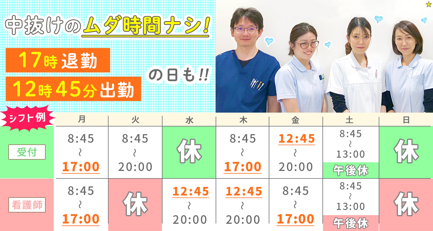 | 休日・休暇 | 週休2日(固定シフト制) ※土曜PM、日曜、祝日は休診 ※休暇:夏季、年末年始、産休・育休、慶弔 |