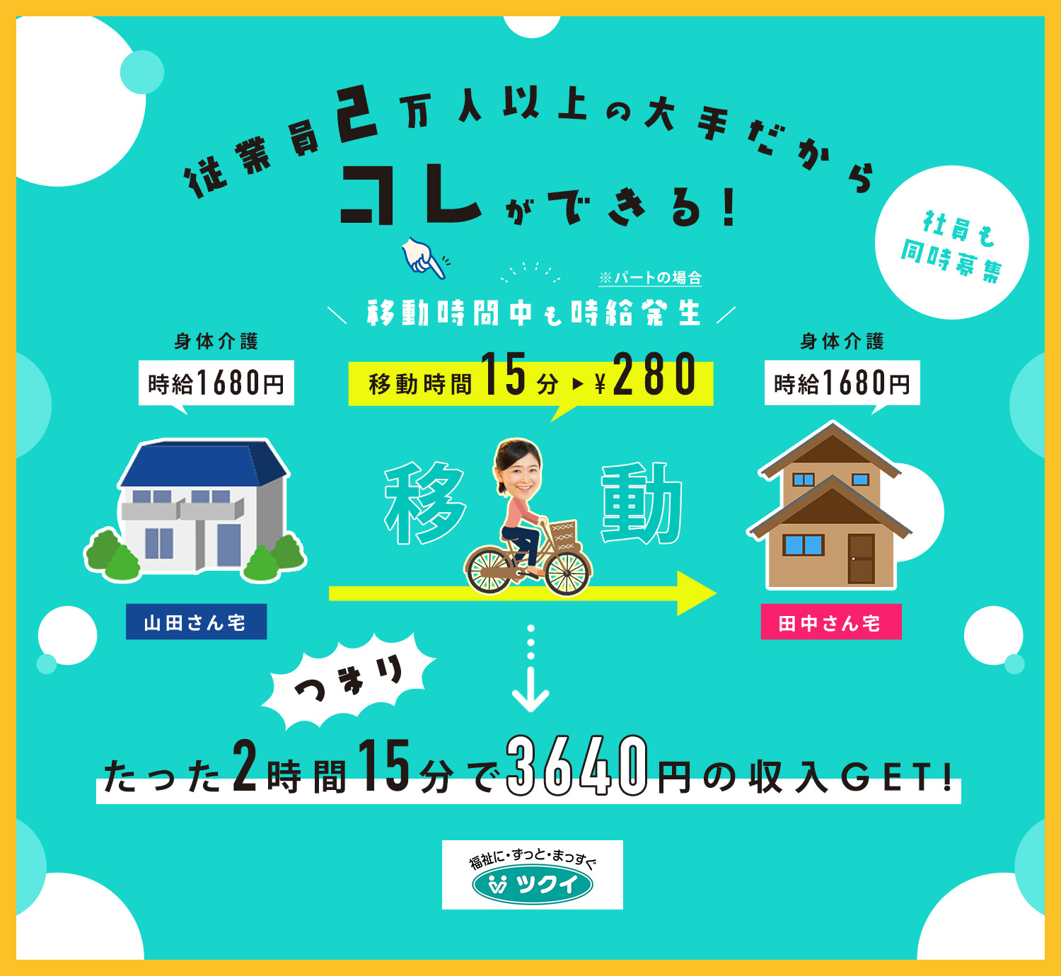 | 待 遇 | #賞与あり 年2回 #昇給あり 社会保険完備 交通費実費支給 (月5万円まで) 母(父)子育児手当 (18歳未満の子:月1万円) 特別手当 時間外勤務手当 ICT手当 (月2000円) キャリアパス制度 産後パパ育休制度 公的資格取得・自己啓発支援制度 エプロン貸与 休憩スペースあり(電子レンジ・冷蔵庫使用OK) 髪型・髪色自由 (社内規定あり) ネイル・まつげエクステ・ひげOK (社内規定あり) ツクイPLUS(独自の福利厚生) ◎結婚・出生・入学のお祝い金の給付 (5000円~2万円) ◎宿泊費の補助 (7000円/年1回) ◎ヘルスチェック補助として最大1万円給付 など  |