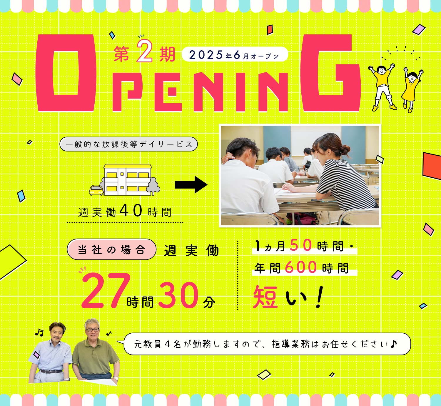 | 仕事内容 | 児童発達支援管理責任者/週実働27時間30分[契] 発達に軽度の遅れが見られたり、学習につまずきがあるお子さま(小学校高学年~中学生が中心)を対象とした療育支援・支援計画の作成などをお願いします。 ※学習指導はありません。支援計画の作成など、児発管業務に専念できます。 <一日のスケジュール/一例> 13:00~ ミーティング・受入れ準備 14:00~ 送迎開始 15:00~ 児童生徒はじめの会/おやつタイム☆ 16:00~ 学習指導 17:30~ おわりの会・次回連絡 17:30~ 最終送迎  |