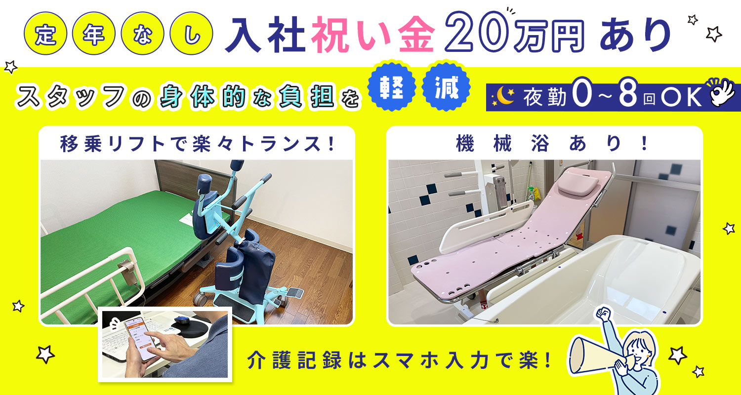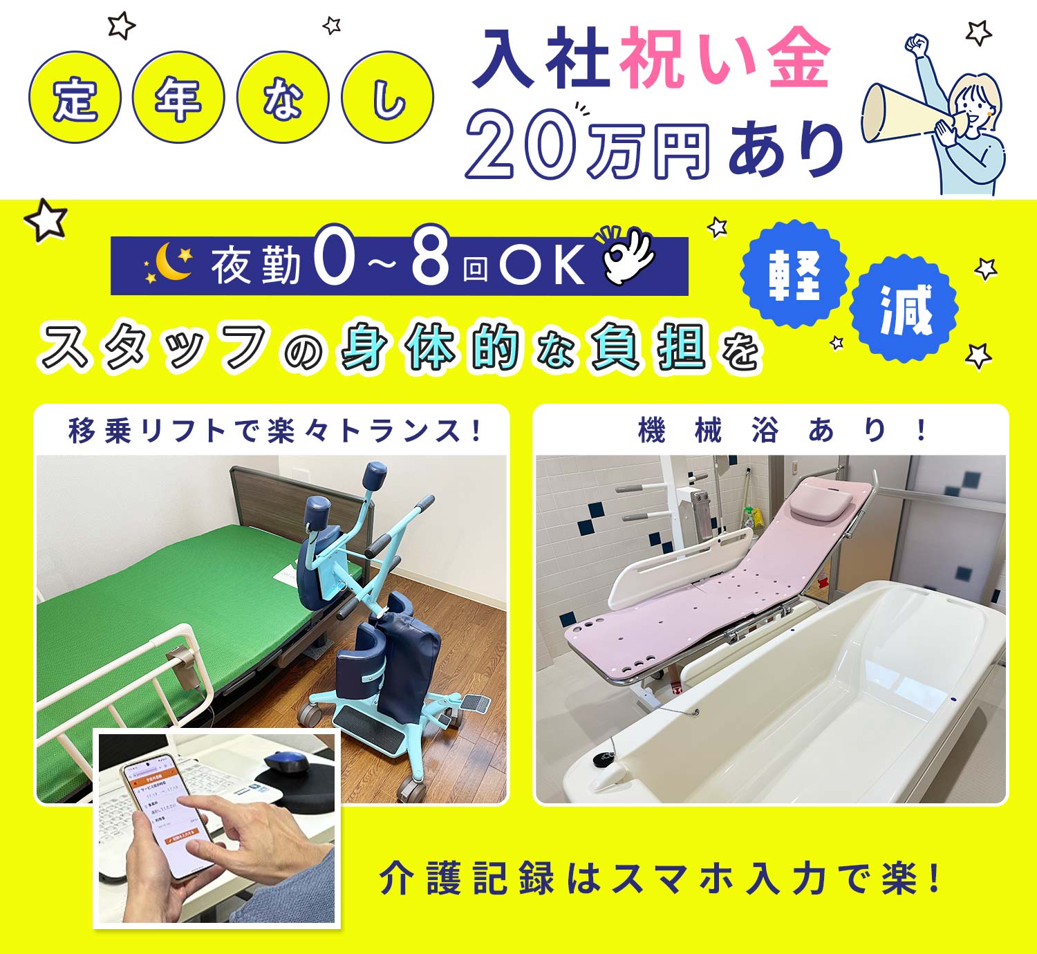 | 応募資格 | (1)介護職員初任者研修修了(旧ヘルパー2級)以上 (2)介護福祉士 #ブランクOK ※定年なし (50代以上の採用実績あり) ※ミドルも歓迎 |