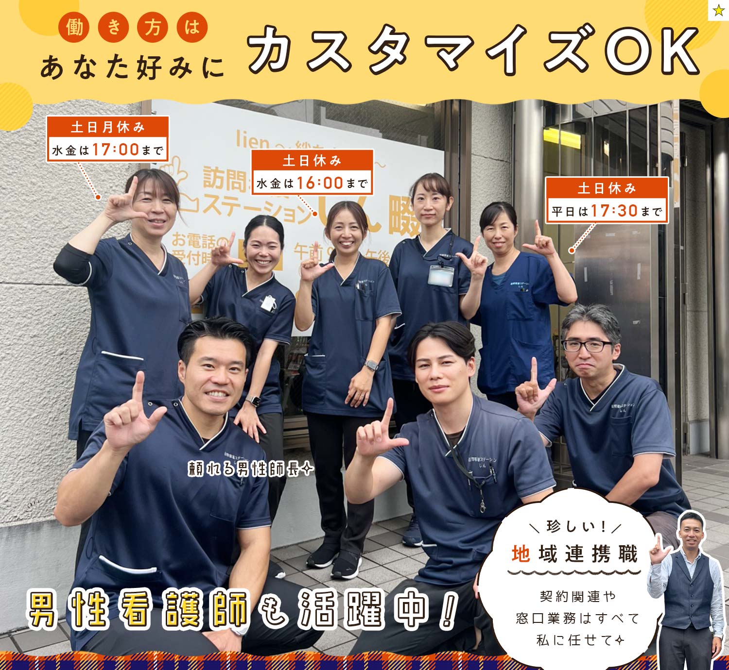 また、当事業所には8名の常勤看護師が在籍しており、男性も管理者を含め3名が活躍中!