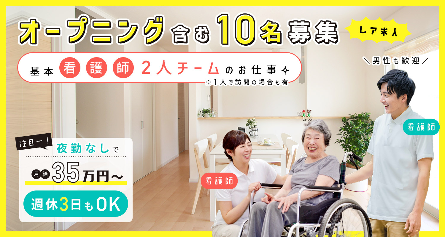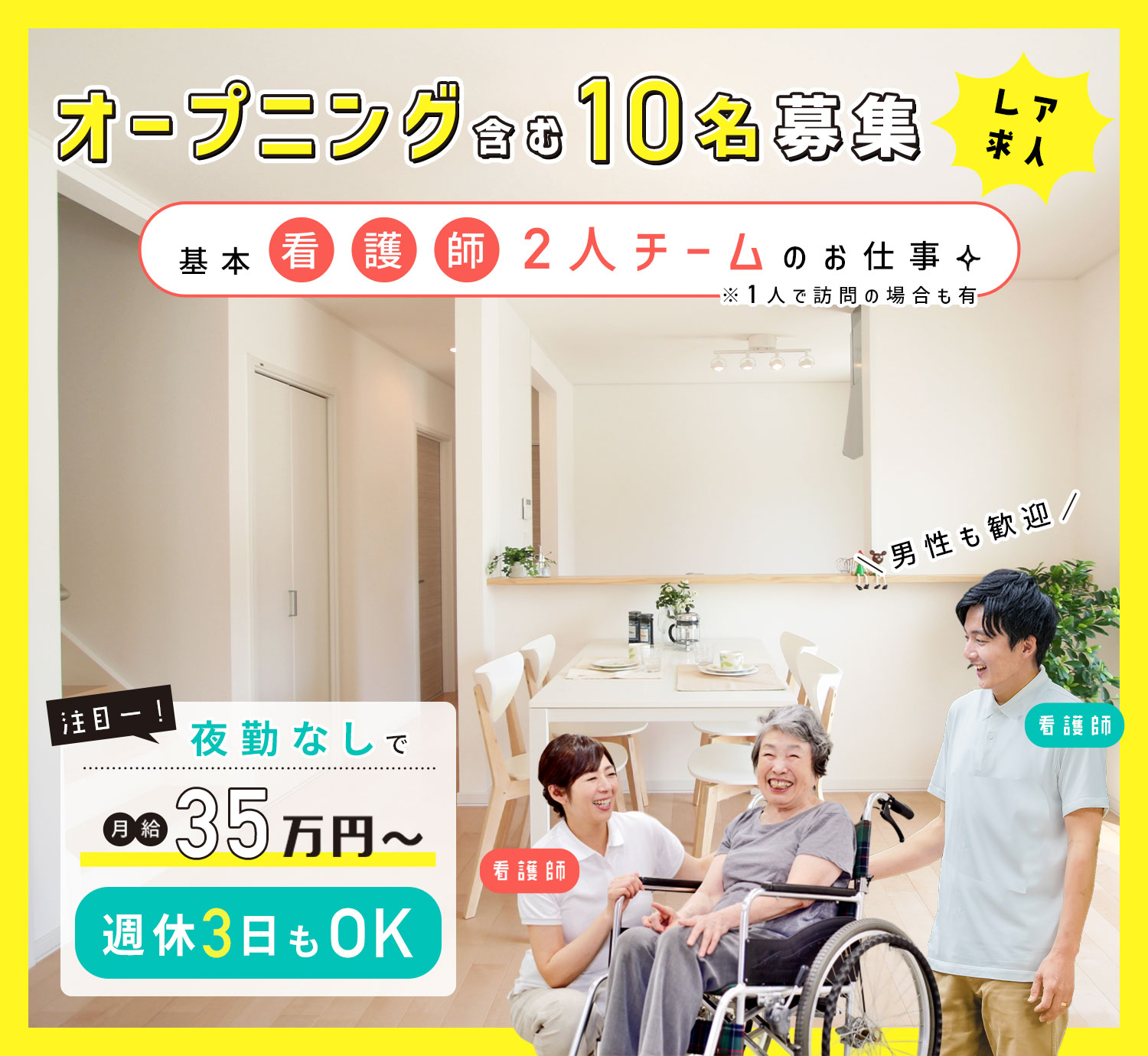 | 応募資格 | 正看護師 #ブランクOK ※病棟からの転職も歓迎 ※訪問未経験OK ※年齢不問!シニア・ミドルも歓迎 ※普通自動車免許(AT)ある方も歓迎 |