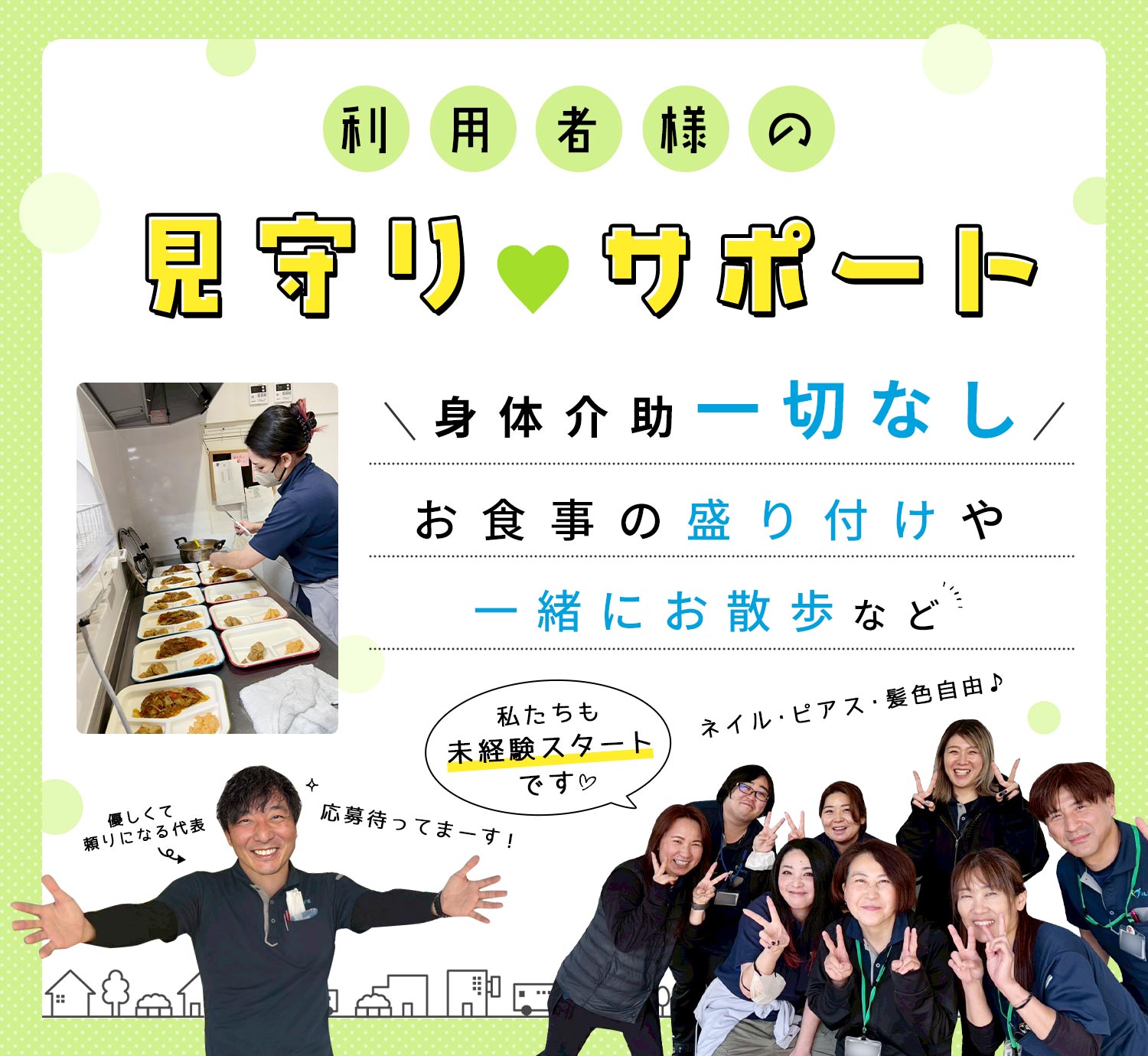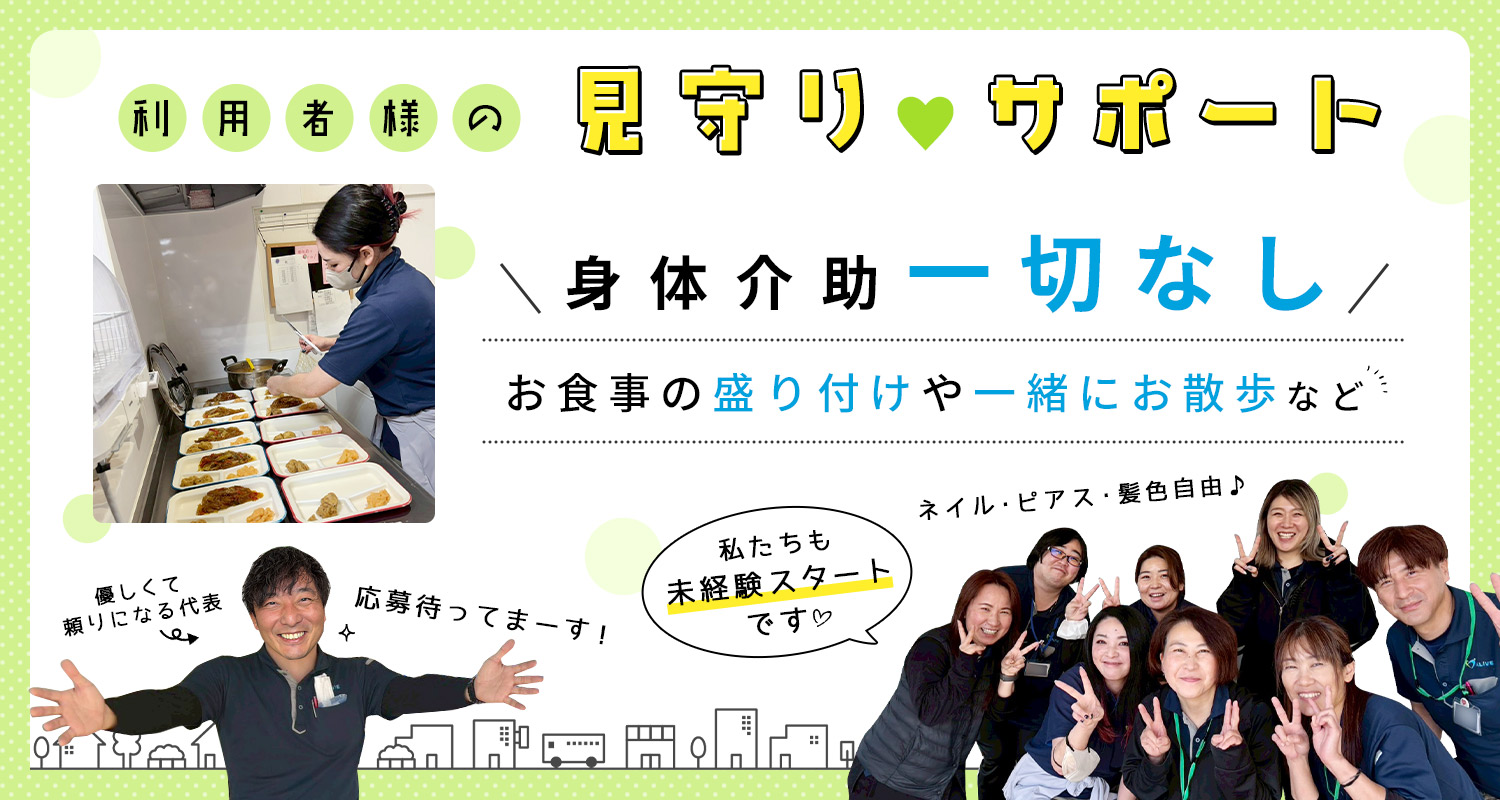 送迎の時間以外に施設内で勤務することも可能で、利用者様のお話し相手になったり、一緒に散歩に出掛けたり、お皿洗いをしたり、カンタンな業務をお任せします!