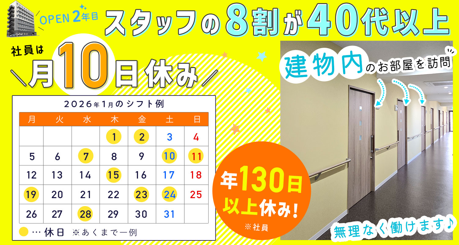 | 休日・休暇 | 完全週休2日制(月10日休み) ※年間休日125日 ※有給は年5日は必ず取得できるため、年130日以上のお休み(当社規定有) ※シフト制(連休や土日休みも相談OK) <休暇> 有給、夏季(7月~9月の間で2日)、冬季(11月~1月の間で2日)、誕生日休暇(誕生日月に1日休み) ※夏季・冬期・誕生日休暇は、月10日のお休みにプラスで取得可能(入職1年経過後から付与) |