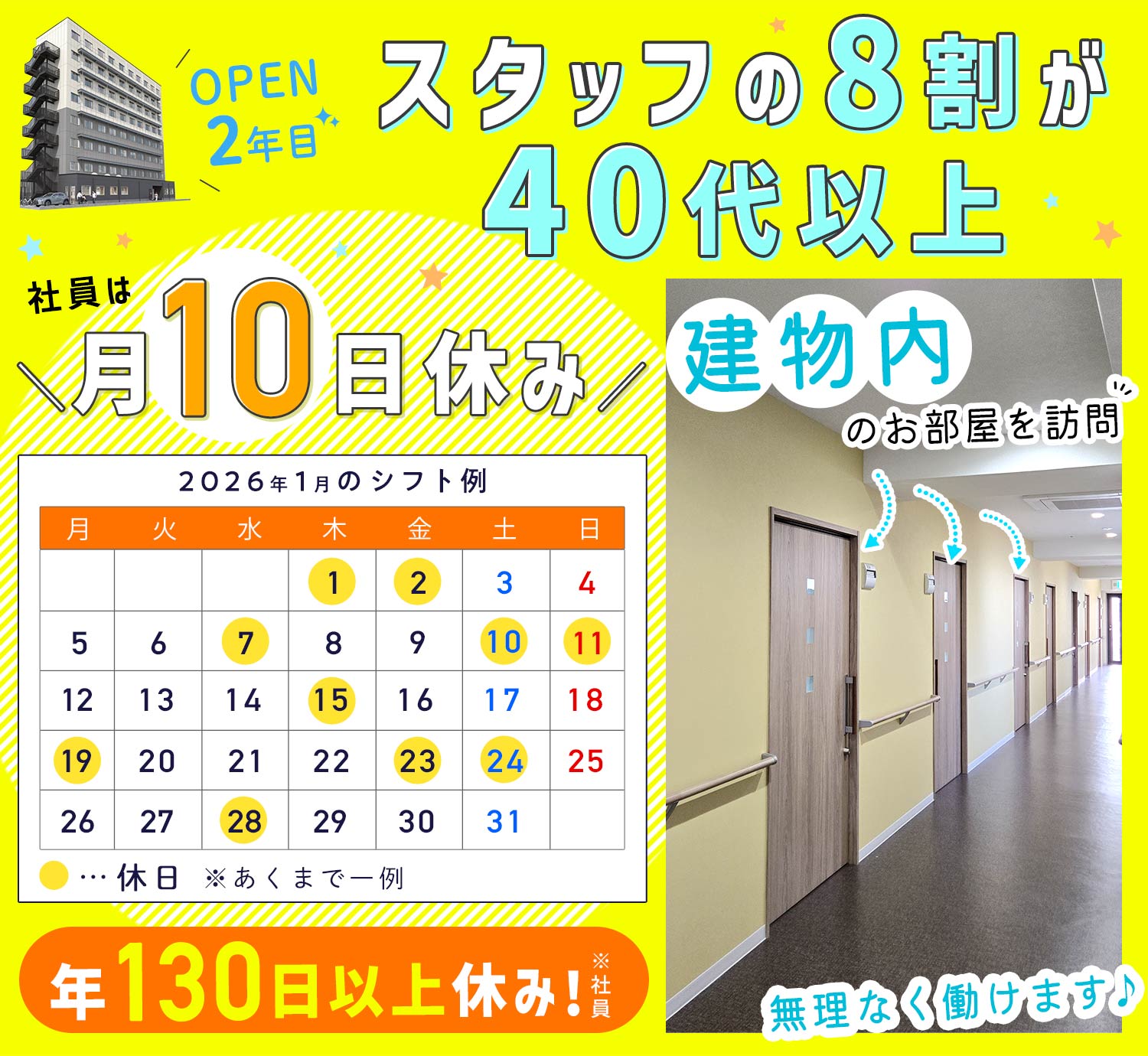 | 休日・休暇 | 週1日~勤務OK ※曜日固定OK ※月2回、週3回、など働き方の相談OK |