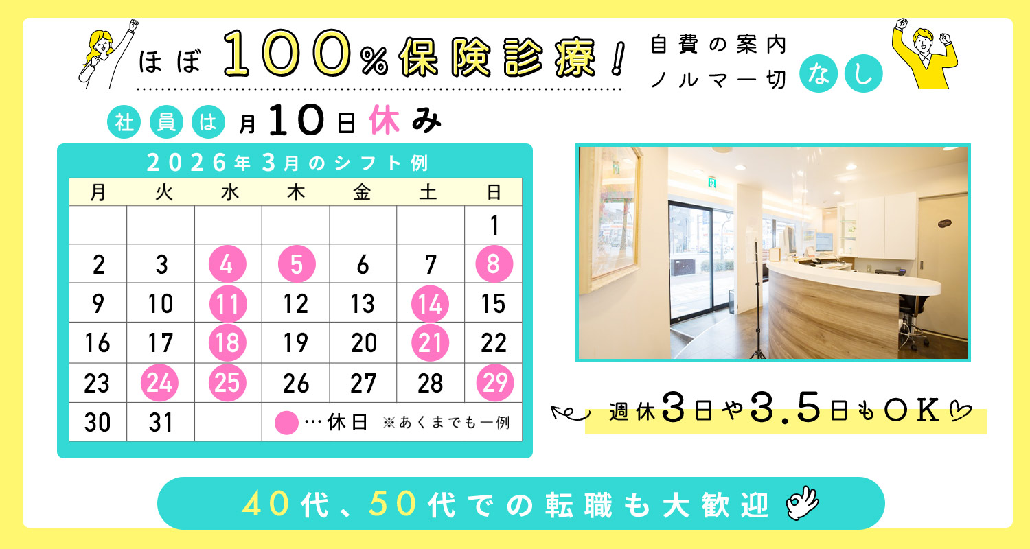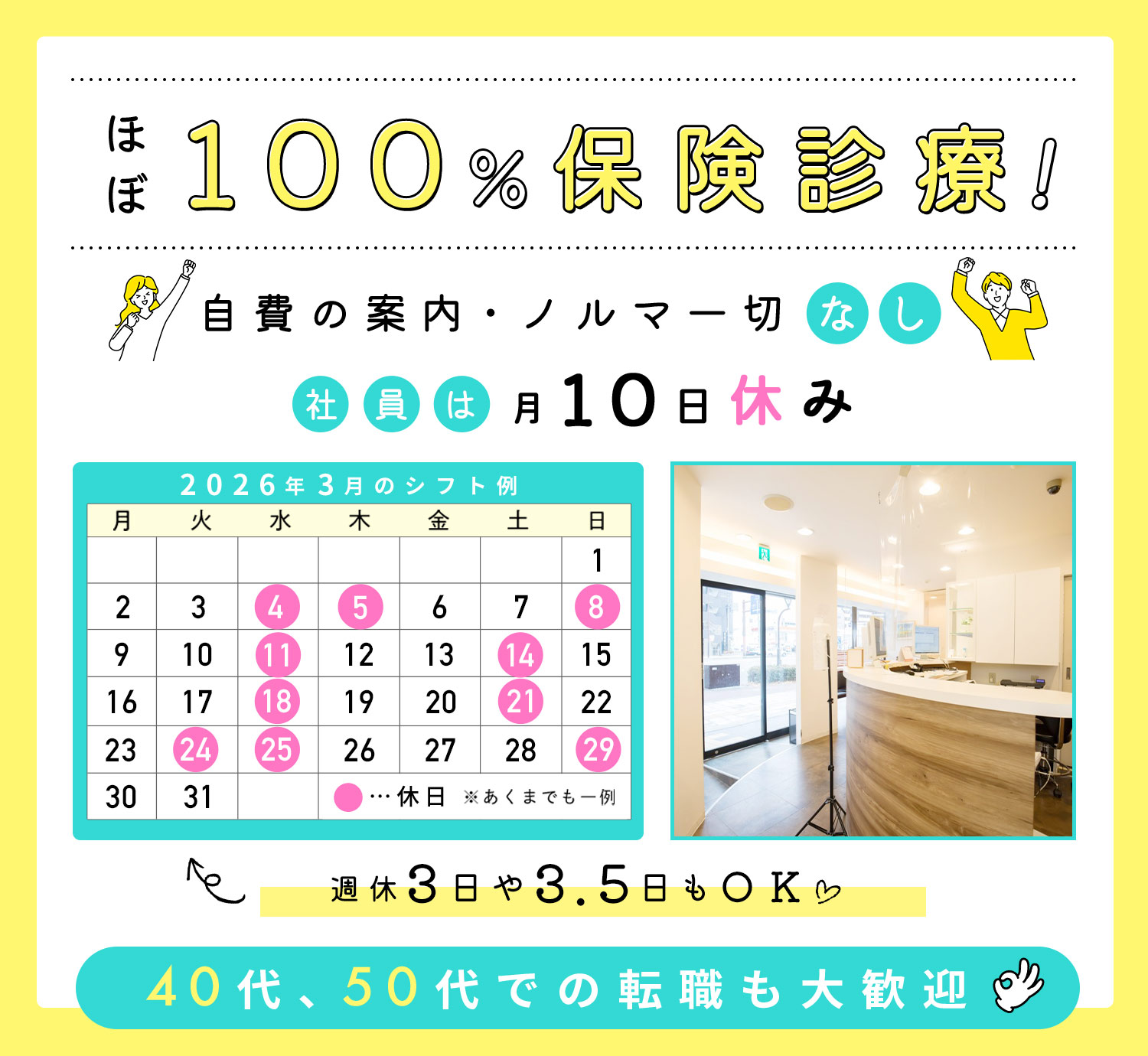 ※ほぼ100%保険診療・一般歯科。自費診療の案内やノルマは一切なし